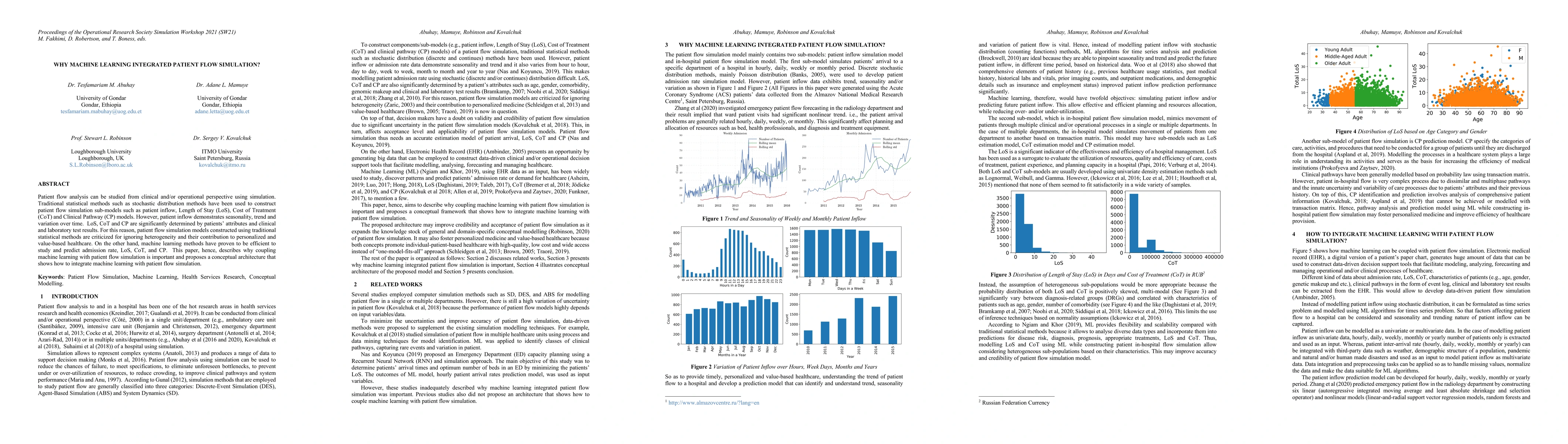 Patient flow analysis can be studied from a clinical and or operational perspective using simulation. Traditional statistical methods such as stochastic distribution methods have been used to construct patient flow simulation submodels such as patient inflow, Length of Stay (LoS), Cost of Treatment (CoT) and Clinical Pathway (CP) models. However, patient inflow demonstrates seasonality, trend and variation over time. LoS, CoT and CP are significantly determined by attributes of patients and clinical and laboratory test results. For this reason, patient flow simulation models constructed using traditional statistical methods are criticized for ignoring heterogeneity and their contribution to personalized and value based healthcare. On the other hand, machine learning methods have proven to be efficient to study and predict admission rate, LoS, CoT, and CP. This paper, hence, describes why coupling machine learning with patient flow simulation is important and proposes a conceptual architecture that shows how to integrate machine learning with patient flow simulation.
