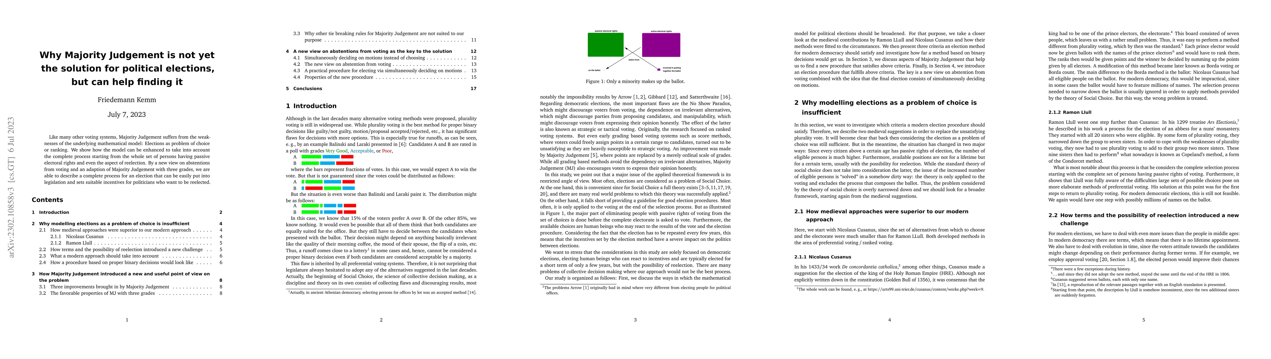 Summary: Majority Judgement, despite its mathematical model flaws, can be improved to address election issues by considering the entire electoral process and incentivizing reelection. Enhanced with three grades and a new view on abstentions, it offers a comprehensive framework adaptable to legislation.