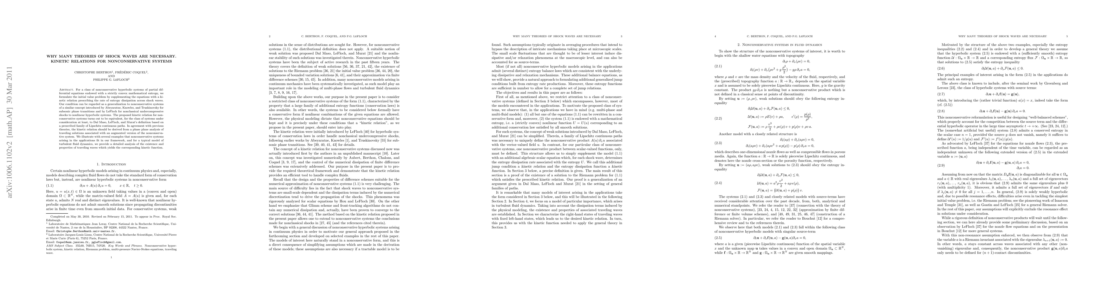 This paper develops a kinetic relation for nonconservative hyperbolic systems to describe entropy dissipation across shock waves, generalizing previous concepts for subsonic phase transitions and undercompressive shocks. It shows equivalence with an existing definition and provides a detailed analysis for a model of turbulent fluid dynamics.