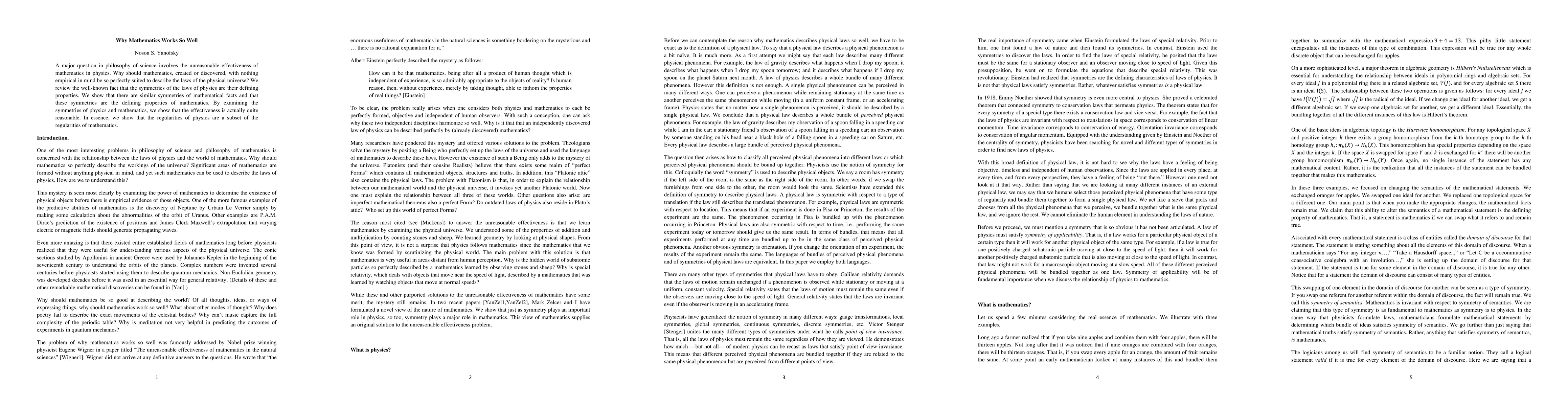 This paper explores the philosophical question of why mathematics is so effective in describing physical laws, arguing that the symmetries inherent in both physics and mathematics provide a reasonable explanation for this phenomenon. The study concludes that the regularities found in physics are a subset of those found in mathematics.
