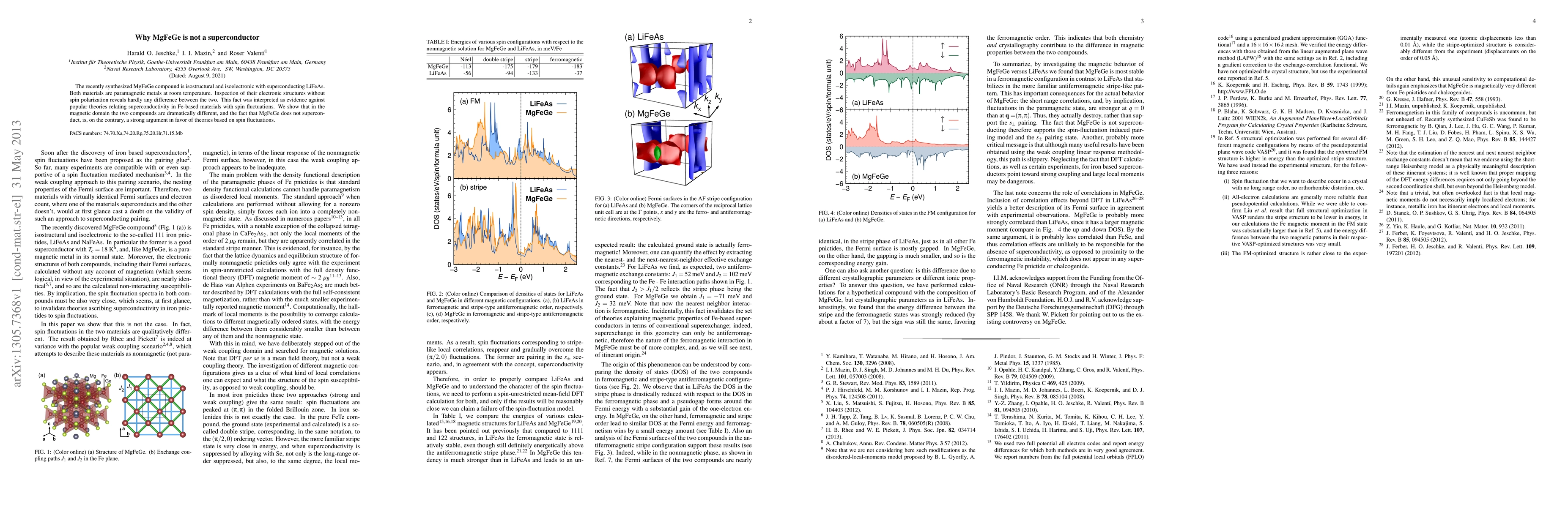 Despite being isostructural and isoelectronic with superconducting LiFeAs, MgFeGe does not exhibit superconductivity. This is attributed to differences in magnetic domains, providing strong support for theories linking superconductivity in Fe-based materials to spin fluctuations.