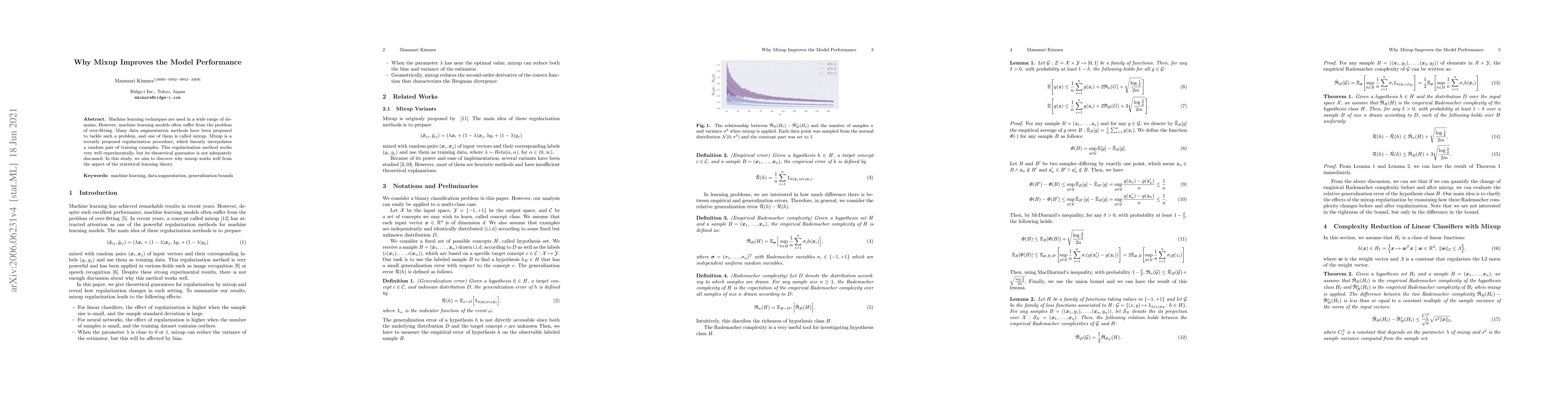 Machine learning techniques are used in a wide range of domains. However, machine learning models often suffer from the problem of over-fitting. Many data augmentation methods have been proposed to tackle such a problem, and one of them is called mixup. Mixup is a recently proposed regularization procedure, which linearly interpolates a random pair of training examples. This regularization method works very well experimentally, but its theoretical guarantee is not adequately discussed. In this study, we aim to discover why mixup works well from the aspect of the statistical learning theory.