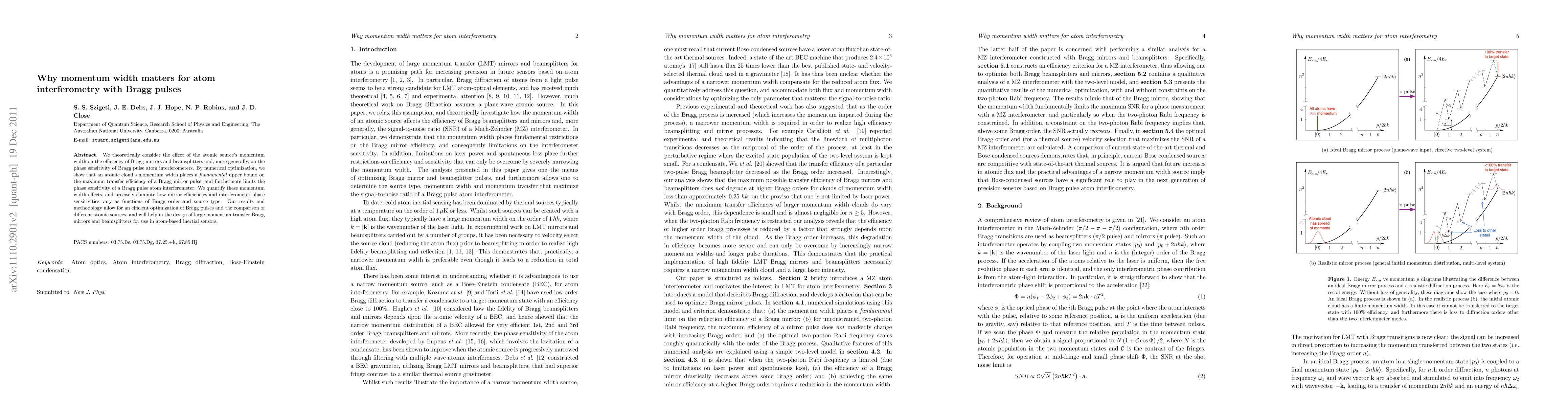 This paper explores the impact of atomic momentum width on the efficiency of Bragg mirrors and beamsplitters in atom interferometry, demonstrating that it sets a fundamental upper limit on transfer efficiency and phase sensitivity. The study provides a quantitative analysis of these effects and aids in optimizing Bragg pulses and comparing different atomic sources for improved inertial sensors.