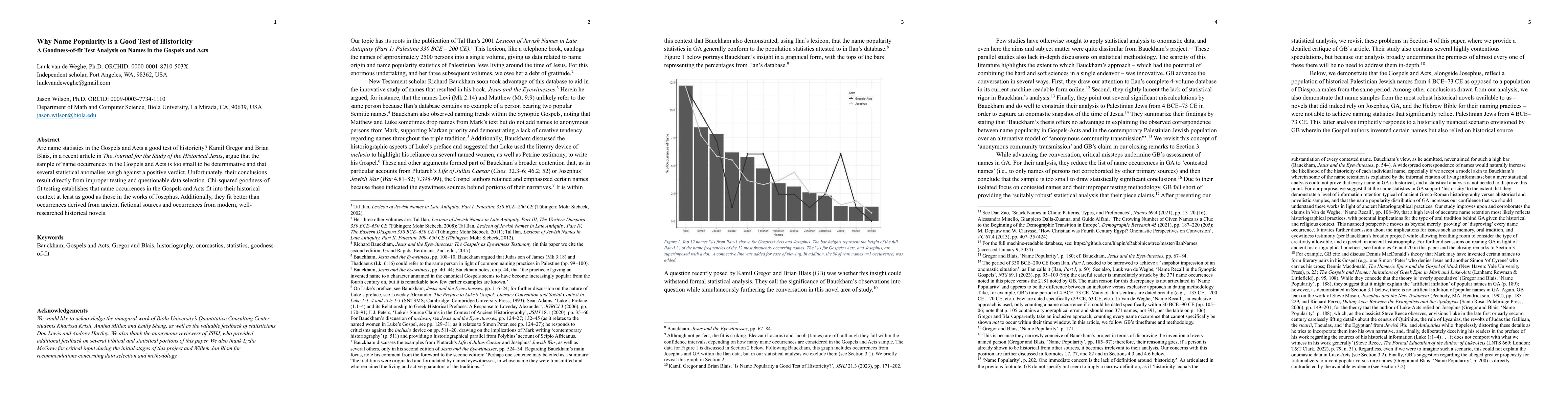 Are name statistics in the Gospels and Acts a good test of historicity? Kamil Gregor and Brian Blais, in a recent article in The Journal for the Study of the Historical Jesus, argue that the sample of name occurrences in the Gospels and Acts is too small to be determinative and that several statistical anomalies weigh against a positive verdict. Unfortunately, their conclusions result directly from improper testing and questionable data selection. Chi-squared goodness-of-fit testing establishes that name occurrences in the Gospels and Acts fit into their historical context at least as good as those in the works of Josephus. Additionally, they fit better than occurrences derived from ancient fictional sources and occurrences from modern, well-researched historical novels.