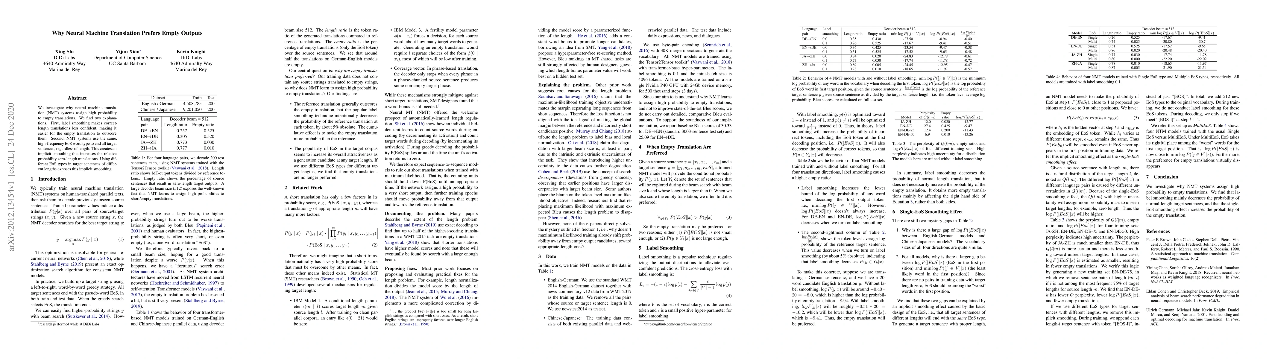 We investigate why neural machine translation (NMT) systems assign high probability to empty translations. We find two explanations. First, label smoothing makes correct-length translations less confident, making it easier for the empty translation to finally outscore them. Second, NMT systems use the same, high-frequency EoS word to end all target sentences, regardless of length. This creates an implicit smoothing that increases zero-length translations. Using different EoS types in target sentences of different lengths exposes and eliminates this implicit smoothing.