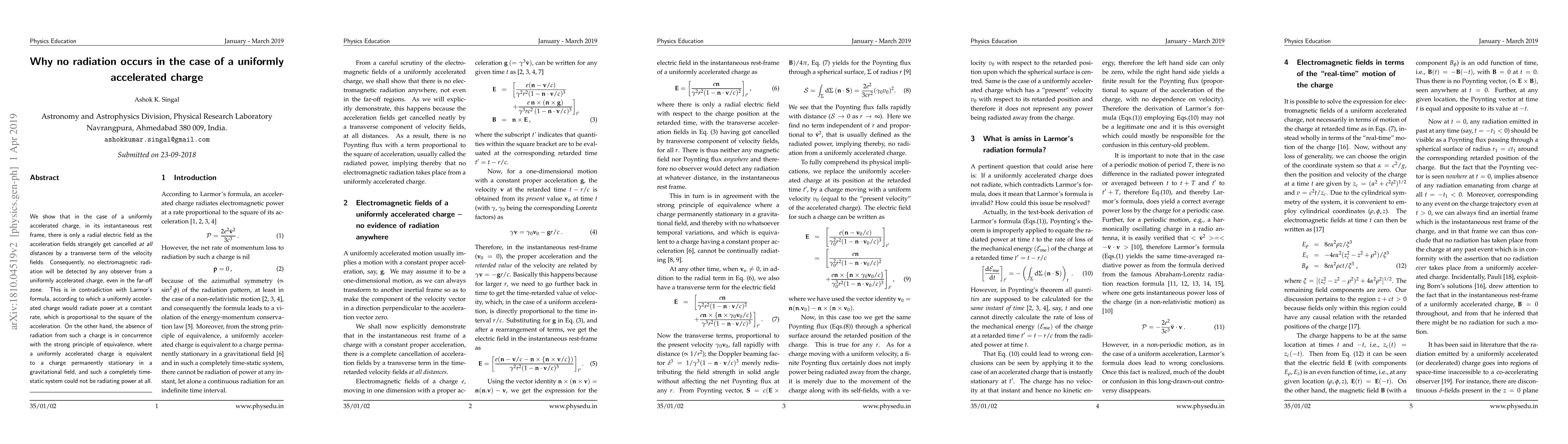 This paper demonstrates that a uniformly accelerated charge does not emit electromagnetic radiation due to the cancellation of acceleration fields by velocity fields in its instantaneous rest frame, contradicting Larmor's formula but aligning with the principle of equivalence in gravitational fields.