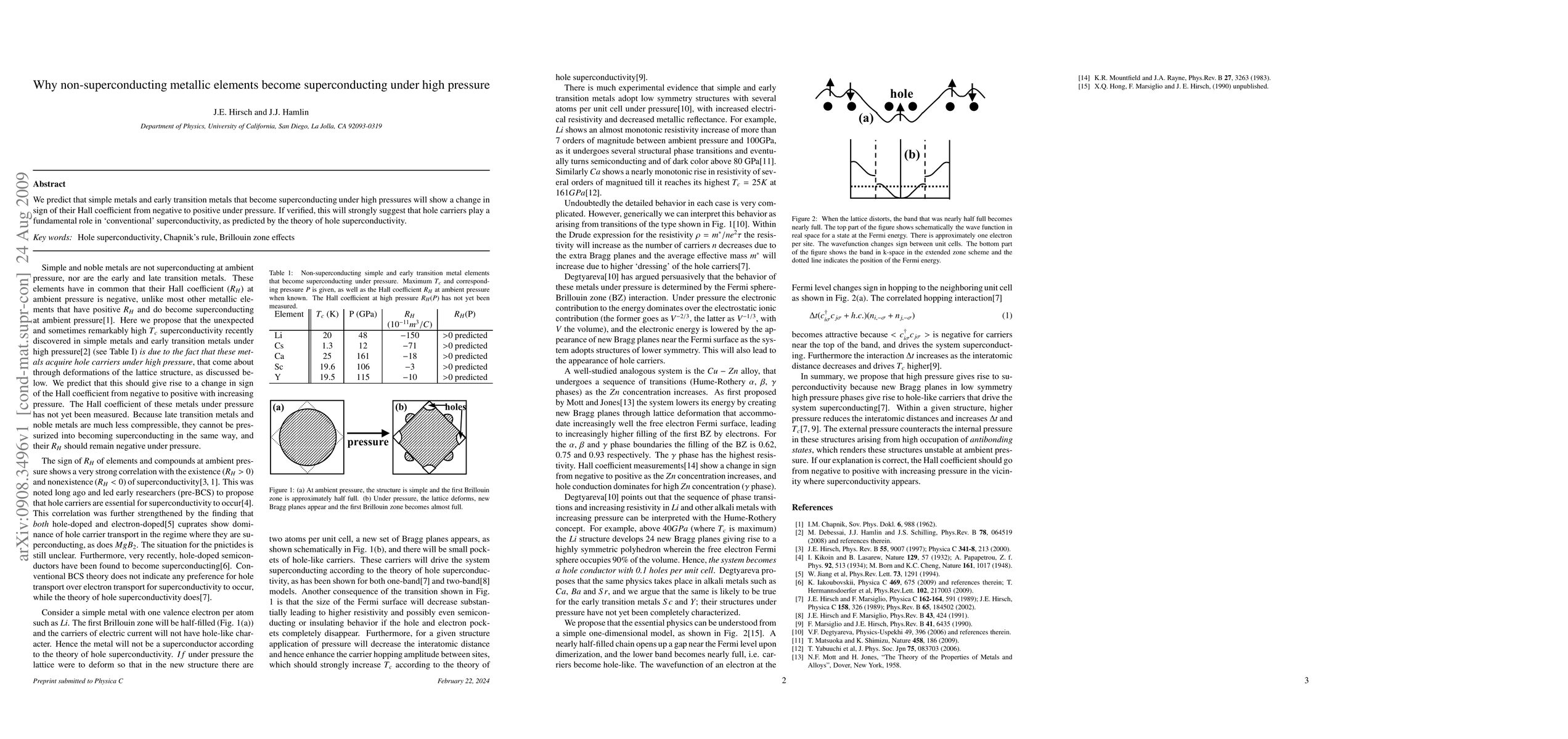 Researchers predict that high pressure will change the sign of Hall coefficient from negative to positive in certain metals, suggesting hole carriers play a role in conventional superconductivity. This finding supports the theory of hole superconductivity.