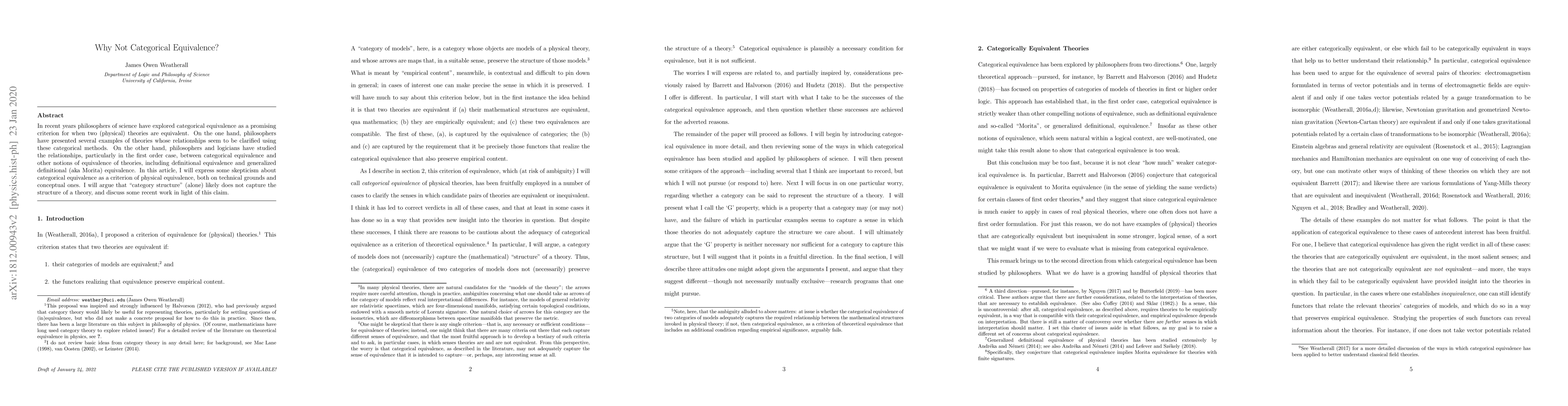 This paper expresses skepticism about using categorical equivalence as a criterion for theory equivalence, arguing that it fails to capture the full structure of theories and highlighting technical and conceptual issues. The author suggests that category structure alone is insufficient for understanding the relationships between physical theories.