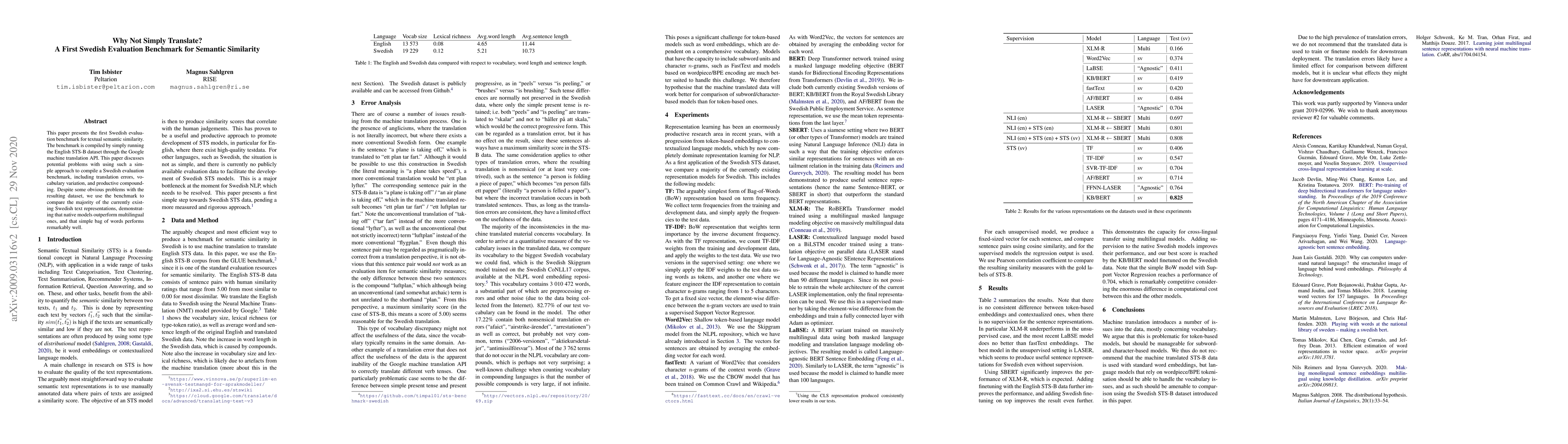 This paper presents the first Swedish evaluation benchmark for textual semantic similarity. The benchmark is compiled by simply running the English STS-B dataset through the Google machine translation API. This paper discusses potential problems with using such a simple approach to compile a Swedish evaluation benchmark, including translation errors, vocabulary variation, and productive compounding. Despite some obvious problems with the resulting dataset, we use the benchmark to compare the majority of the currently existing Swedish text representations, demonstrating that native models outperform multilingual ones, and that simple bag of words performs remarkably well.