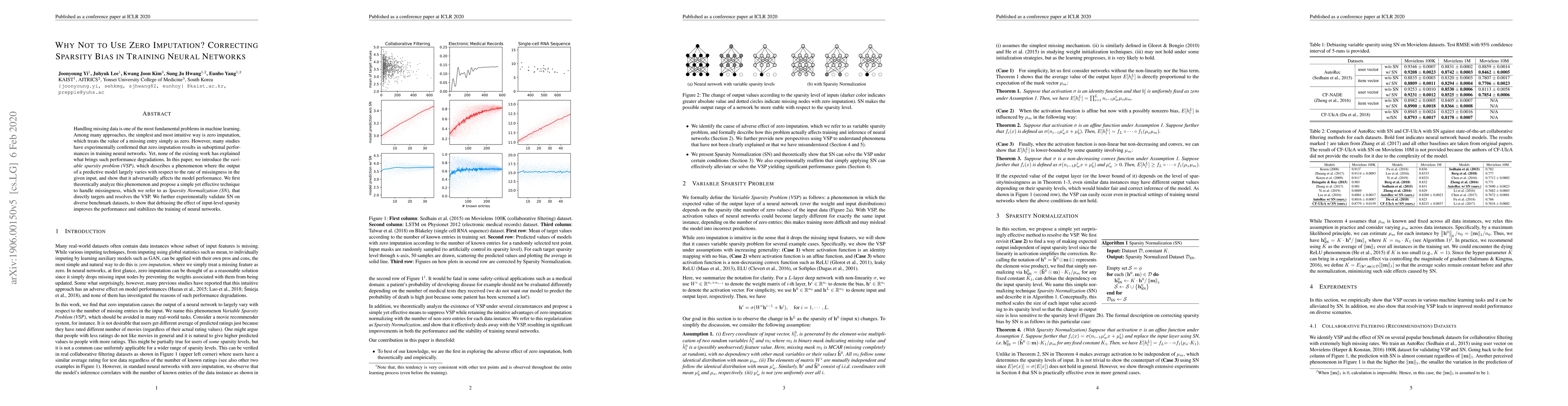 Handling missing data is one of the most fundamental problems in machine learning. Among many approaches, the simplest and most intuitive way is zero imputation, which treats the value of a missing entry simply as zero. However, many studies have experimentally confirmed that zero imputation results in suboptimal performances in training neural networks. Yet, none of the existing work has explained what brings such performance degradations. In this paper, we introduce the variable sparsity problem (VSP), which describes a phenomenon where the output of a predictive model largely varies with respect to the rate of missingness in the given input, and show that it adversarially affects the model performance. We first theoretically analyze this phenomenon and propose a simple yet effective technique to handle missingness, which we refer to as Sparsity Normalization (SN), that directly targets and resolves the VSP. We further experimentally validate SN on diverse benchmark datasets, to show that debiasing the effect of input-level sparsity improves the performance and stabilizes the training of neural networks.