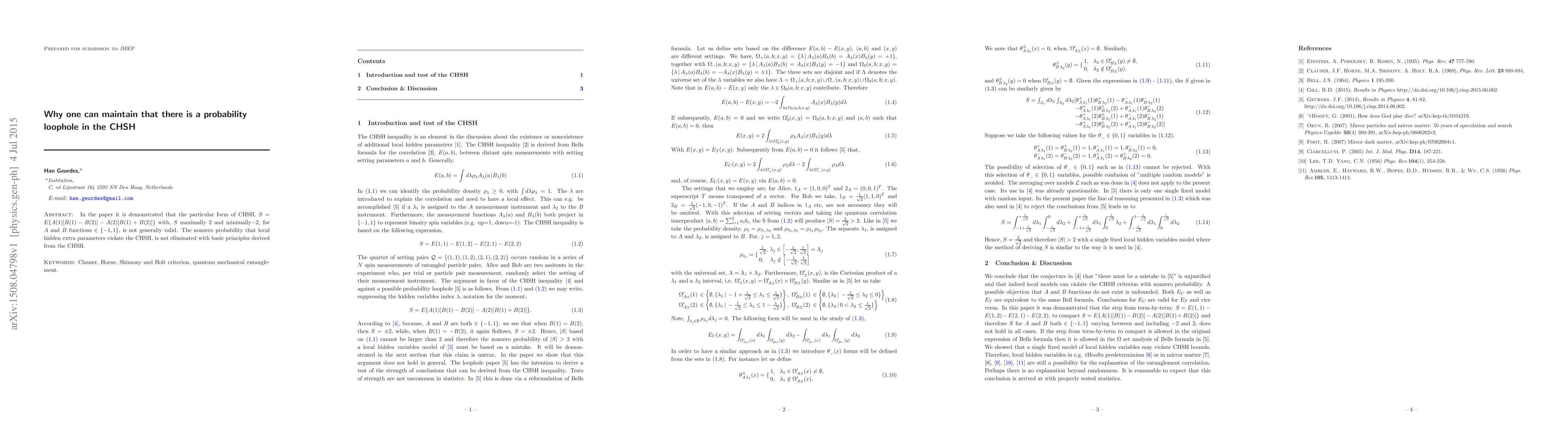 In the paper it is demonstrated that the particular form of CHSH, S=E{A(1)[B(1)-B(2)]-A(2)[B(1)+B(2)]} with, S maximally 2 and minimally -2,for A and B functions in {-1,1}, is not generally valid. The nonzero probability that local hidden extra parameters violate the CHSH, is not eliminated with basic principles derived from the CHSH.