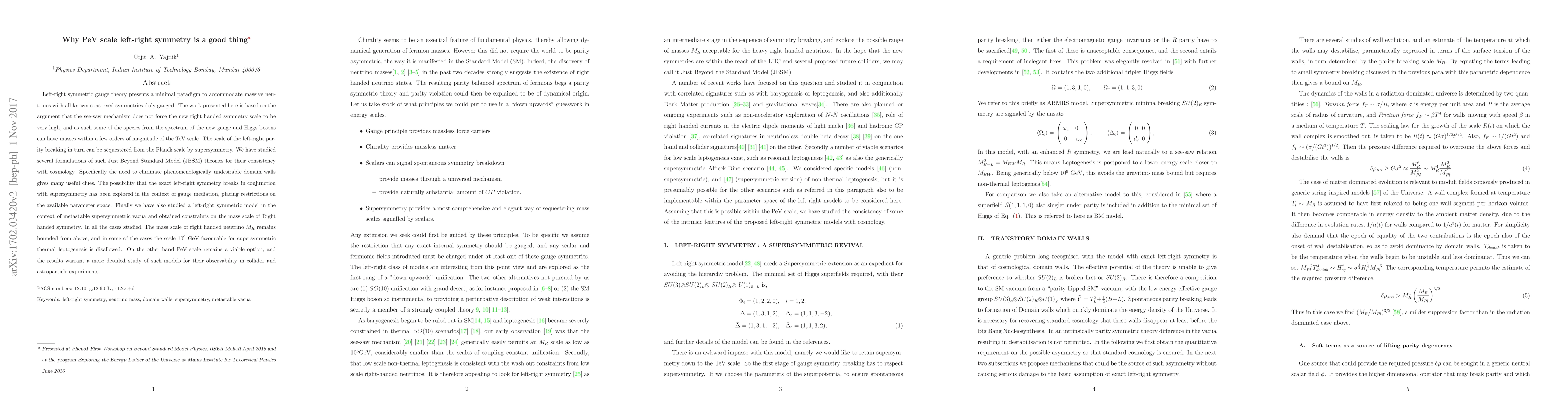 This paper argues that PeV scale left-right symmetry in gauge theories is viable due to the see-saw mechanism, which does not necessitate an excessively high symmetry breaking scale. It discusses the consistency of these models with cosmology, emphasizing the importance of avoiding domain walls and exploring the implications of supersymmetry.