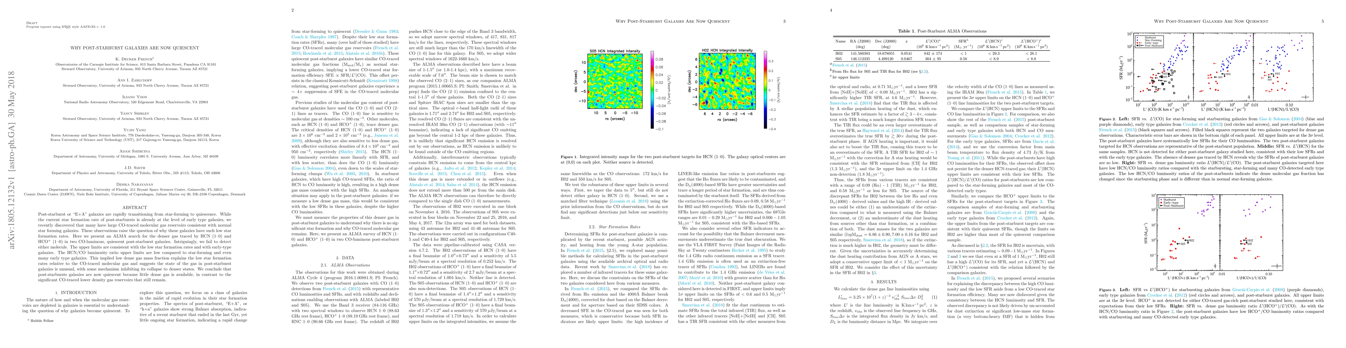 Post-starburst galaxies transition from star-forming to quiescent states due to a lack of dense gas, despite having large CO-traced molecular gas reservoirs. ALMA observations reveal no detectable HCN or HCO+ molecules, indicating a low dense gas mass fraction that inhibits star formation.