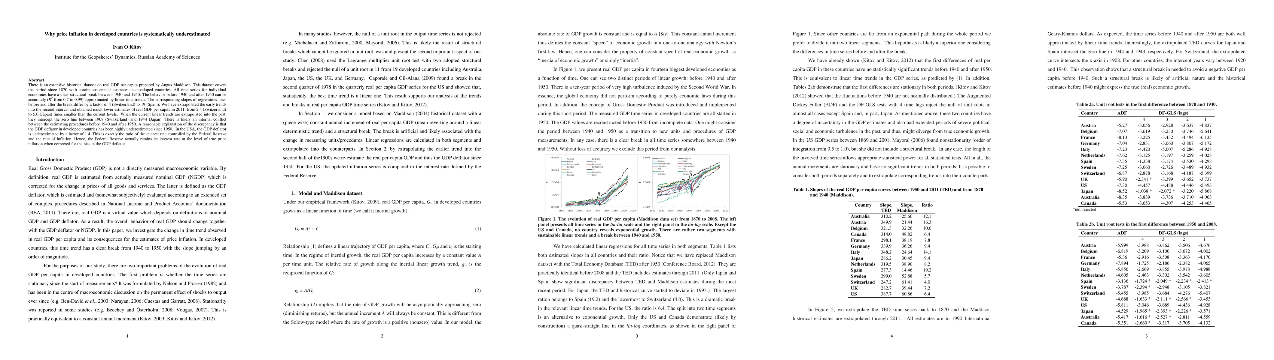 There is an extensive historical dataset on real GDP per capita prepared by Angus Maddison. This dataset covers the period since 1870 with continuous annual estimates in developed countries. All time series for individual economies have a clear structural break between 1940 and 1950. The behavior before 1940 and after 1950 can be accurately (R2 from 0.7 to 0.99) approximated by linear time trends. The corresponding slopes of regressions lines before and after the break differ by a factor of 4 (Switzerland) to 19 (Spain). We have extrapolated the early trends into the second interval and obtained much lower estimates of real GDP per capita in 2011: from 2.4 (Switzerland) to 5.0 (Japan) times smaller than the current levels. When the current linear trends are extrapolated into the past, they intercept the zero line between 1908 (Switzerland) and 1944 (Japan). There is likely an internal conflict between the estimating procedures before 1940 and after 1950. A reasonable explanation of the discrepancy is that the GDP deflator in developed countries has been highly underestimated since 1950. In the USA, the GDP deflator is underestimated by a factor of 1.4. This is exactly the ratio of the interest rate controlled by the Federal Reserve and the rate of inflation. Hence, the Federal Reserve actually retains its interest rate at the level of true price inflation when corrected for the bias in the GDP deflator.