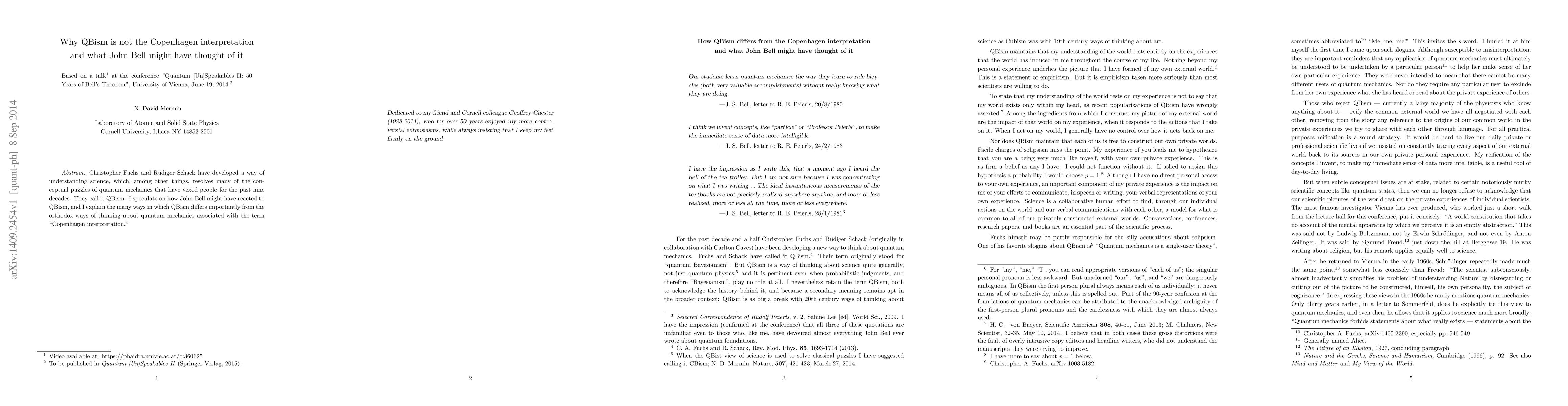 Christopher Fuchs and R\"udiger Schack have developed a way of understanding science, which, among other things, resolves many of the conceptual puzzles of quantum mechanics that have vexed people for the past nine decades. They call it QBism. I speculate on how John Bell might have reacted to QBism, and I explain the many ways in which QBism differs importantly from the orthodox ways of thinking about quantum mechanics associated with the term "Copenhagen interpretation."