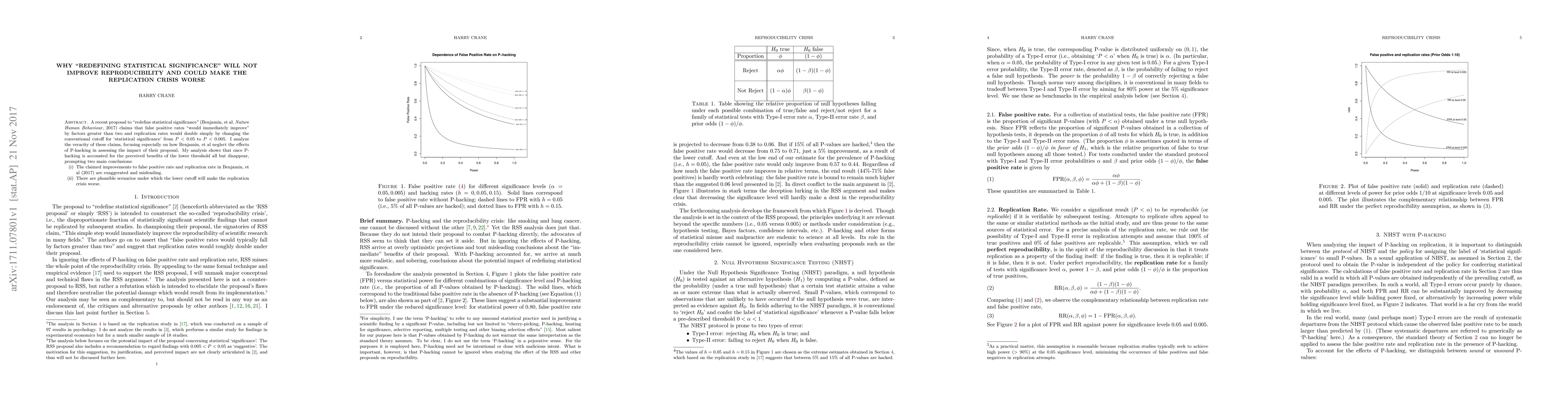 A recent proposal to "redefine statistical significance" (Benjamin, et al. Nature Human Behaviour, 2017) claims that false positive rates "would immediately improve" by factors greater than two and replication rates would double simply by changing the conventional cutoff for 'statistical significance' from P<0.05 to P<0.005. I analyze the veracity of these claims, focusing especially on how Benjamin, et al neglect the effects of P-hacking in assessing the impact of their proposal. My analysis shows that once P-hacking is accounted for the perceived benefits of the lower threshold all but disappear, prompting two main conclusions: (i) The claimed improvements to false positive rate and replication rate in Benjamin, et al (2017) are exaggerated and misleading. (ii) There are plausible scenarios under which the lower cutoff will make the replication crisis worse.