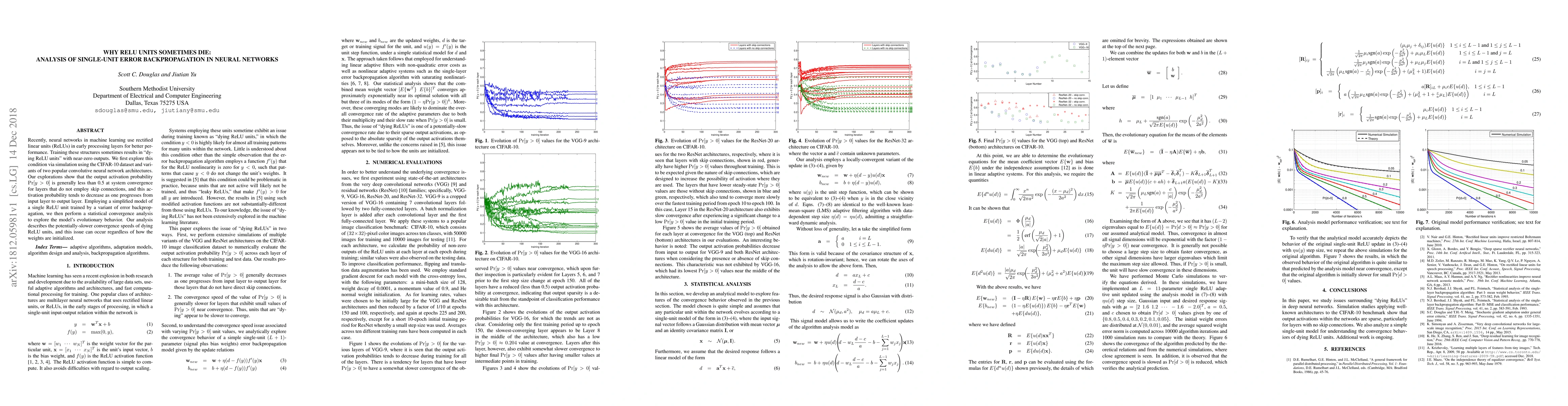 This paper investigates the phenomenon of "dying ReLU units" in neural networks, where ReLU units produce near-zero outputs, using simulations on CIFAR-10 data. It finds that without skip connections, activation probability decreases from input to output layers, and a simplified model analysis reveals slower convergence speeds for these units, irrespective of weight initialization.