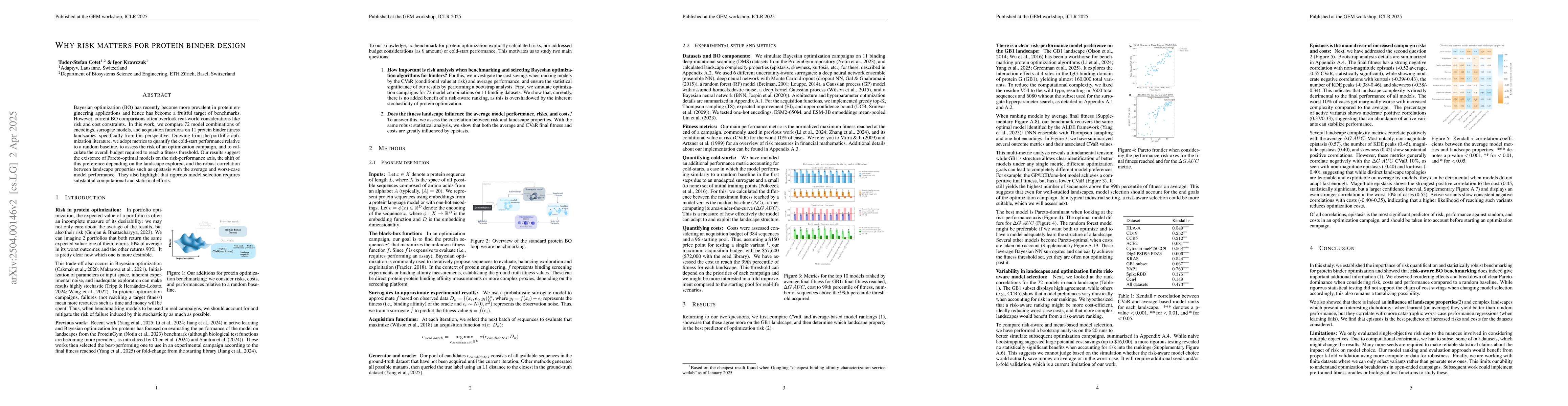 Bayesian optimization (BO) has recently become more prevalent in protein engineering applications and hence has become a fruitful target of benchmarks. However, current BO comparisons often overlook real-world considerations like risk and cost constraints. In this work, we compare 72 model combinations of encodings, surrogate models, and acquisition functions on 11 protein binder fitness landscapes, specifically from this perspective. Drawing from the portfolio optimization literature, we adopt metrics to quantify the cold-start performance relative to a random baseline, to assess the risk of an optimization campaign, and to calculate the overall budget required to reach a fitness threshold. Our results suggest the existence of Pareto-optimal models on the risk-performance axis, the shift of this preference depending on the landscape explored, and the robust correlation between landscape properties such as epistasis with the average and worst-case model performance. They also highlight that rigorous model selection requires substantial computational and statistical efforts.
