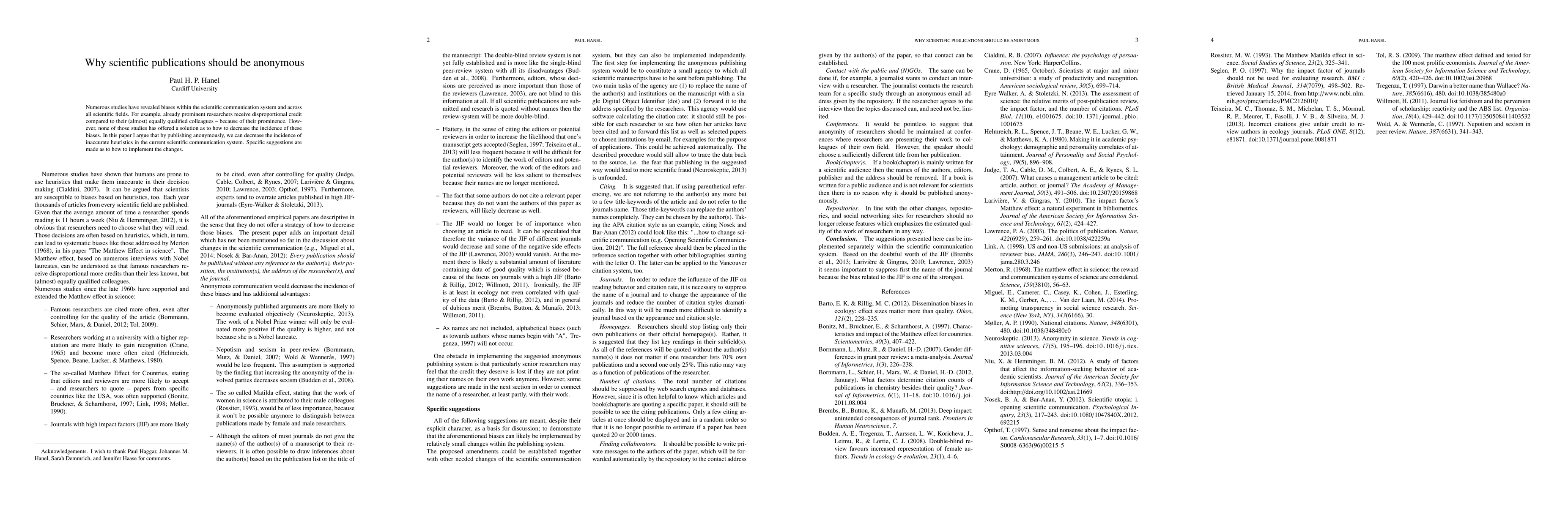 Numerous studies have revealed biases within the scientific communication system and across all scientific fields. For example, already prominent researchers receive disproportional credit compared to their (almost) equally qualified colleagues -- because of their prominence. However, none of those studies has offered a solution as to how to decrease the incidence of these biases. In this paper I argue that by publishing anonymously, we can decrease the incidence of inaccurate heuristics in the current scientific communication system. Specific suggestions are made as to how to implement the changes.