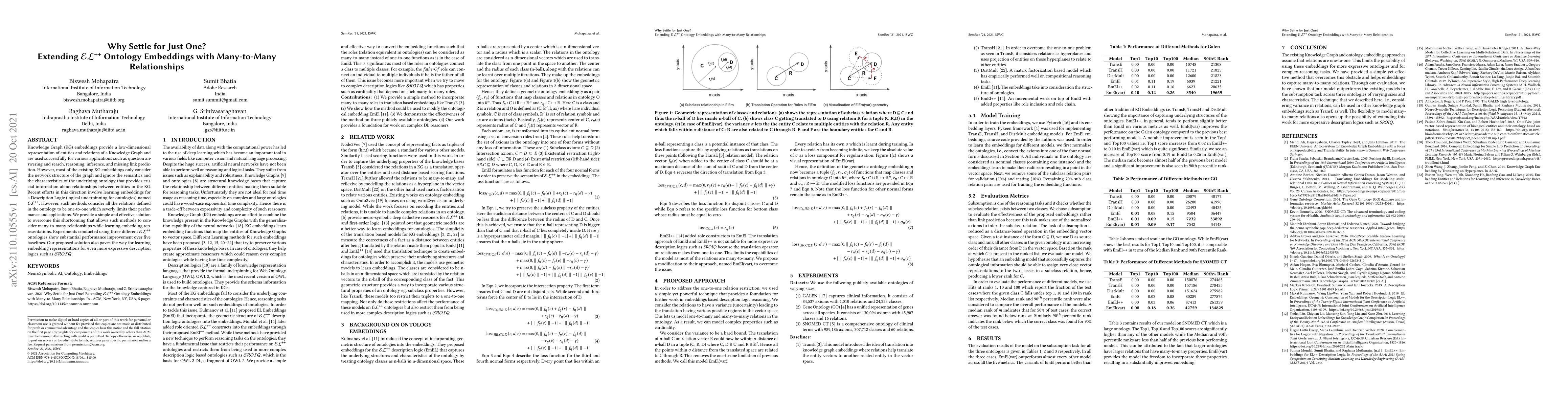 Knowledge Graph (KG) embeddings provide a low-dimensional representation of entities and relations of a Knowledge Graph and are used successfully for various applications such as question answering and search, reasoning, inference, and missing link prediction. However, most of the existing KG embeddings only consider the network structure of the graph and ignore the semantics and the characteristics of the underlying ontology that provides crucial information about relationships between entities in the KG. Recent efforts in this direction involve learning embeddings for a Description Logic (logical underpinning for ontologies) named EL++. However, such methods consider all the relations defined in the ontology to be one-to-one which severely limits their performance and applications. We provide a simple and effective solution to overcome this shortcoming that allows such methods to consider many-to-many relationships while learning embedding representations. Experiments conducted using three different EL++ ontologies show substantial performance improvement over five baselines. Our proposed solution also paves the way for learning embedding representations for even more expressive description logics such as SROIQ.