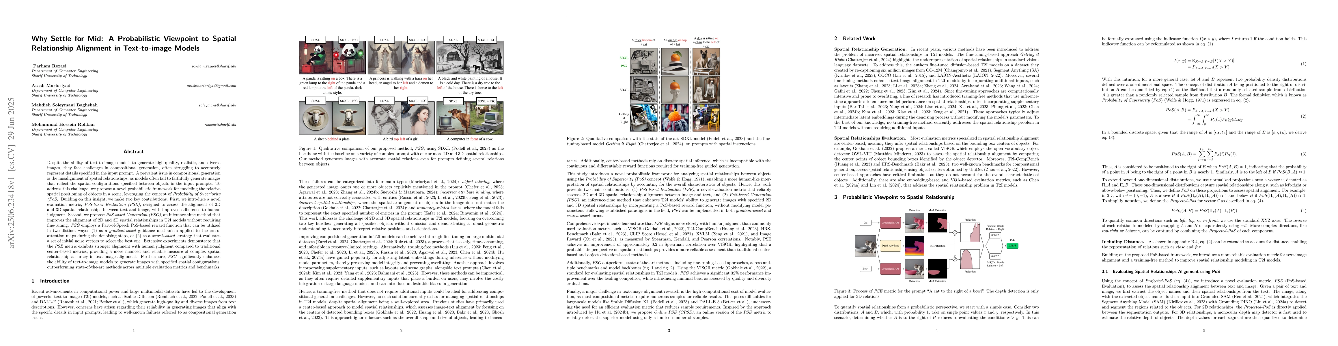 Despite the ability of text-to-image models to generate high-quality, realistic, and diverse images, they face challenges in compositional generation, often struggling to accurately represent details specified in the input prompt. A prevalent issue in compositional generation is the misalignment of spatial relationships, as models often fail to faithfully generate images that reflect the spatial configurations specified between objects in the input prompts. To address this challenge, we propose a novel probabilistic framework for modeling the relative spatial positioning of objects in a scene, leveraging the concept of Probability of Superiority (PoS). Building on this insight, we make two key contributions. First, we introduce a novel evaluation metric, PoS-based Evaluation (PSE), designed to assess the alignment of 2D and 3D spatial relationships between text and image, with improved adherence to human judgment. Second, we propose PoS-based Generation (PSG), an inference-time method that improves the alignment of 2D and 3D spatial relationships in T2I models without requiring fine-tuning. PSG employs a Part-of-Speech PoS-based reward function that can be utilized in two distinct ways: (1) as a gradient-based guidance mechanism applied to the cross-attention maps during the denoising steps, or (2) as a search-based strategy that evaluates a set of initial noise vectors to select the best one. Extensive experiments demonstrate that the PSE metric exhibits stronger alignment with human judgment compared to traditional center-based metrics, providing a more nuanced and reliable measure of complex spatial relationship accuracy in text-image alignment. Furthermore, PSG significantly enhances the ability of text-to-image models to generate images with specified spatial configurations, outperforming state-of-the-art methods across multiple evaluation metrics and benchmarks.