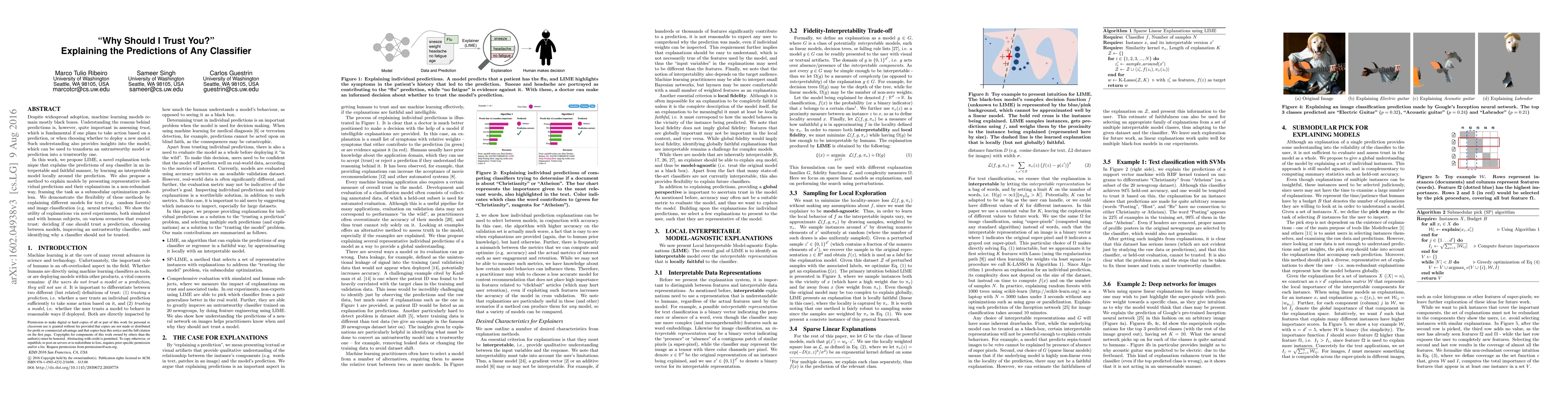 Despite widespread adoption, machine learning models remain mostly black boxes. Understanding the reasons behind predictions is, however, quite important in assessing trust, which is fundamental if one plans to take action based on a prediction, or when choosing whether to deploy a new model. Such understanding also provides insights into the model, which can be used to transform an untrustworthy model or prediction into a trustworthy one. In this work, we propose LIME, a novel explanation technique that explains the predictions of any classifier in an interpretable and faithful manner, by learning an interpretable model locally around the prediction. We also propose a method to explain models by presenting representative individual predictions and their explanations in a non-redundant way, framing the task as a submodular optimization problem. We demonstrate the flexibility of these methods by explaining different models for text (e.g. random forests) and image classification (e.g. neural networks). We show the utility of explanations via novel experiments, both simulated and with human subjects, on various scenarios that require trust: deciding if one should trust a prediction, choosing between models, improving an untrustworthy classifier, and identifying why a classifier should not be trusted.