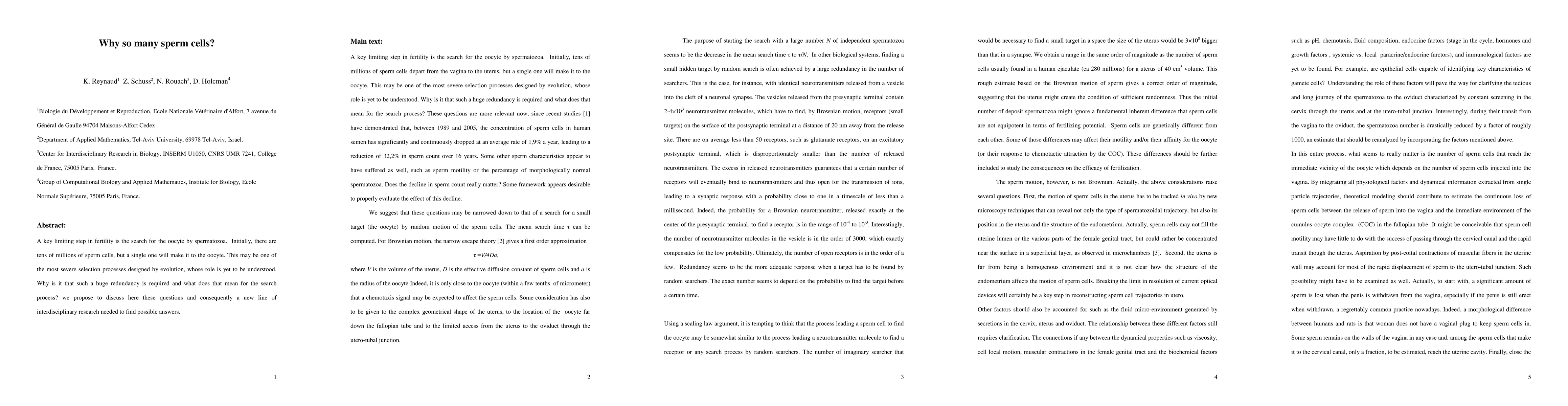 The paper discusses the evolutionary question of why such a large number of sperm cells are produced, despite only one fertilizing the oocyte. It proposes a new interdisciplinary research direction to understand this redundancy and its implications for the sperm's search process.
