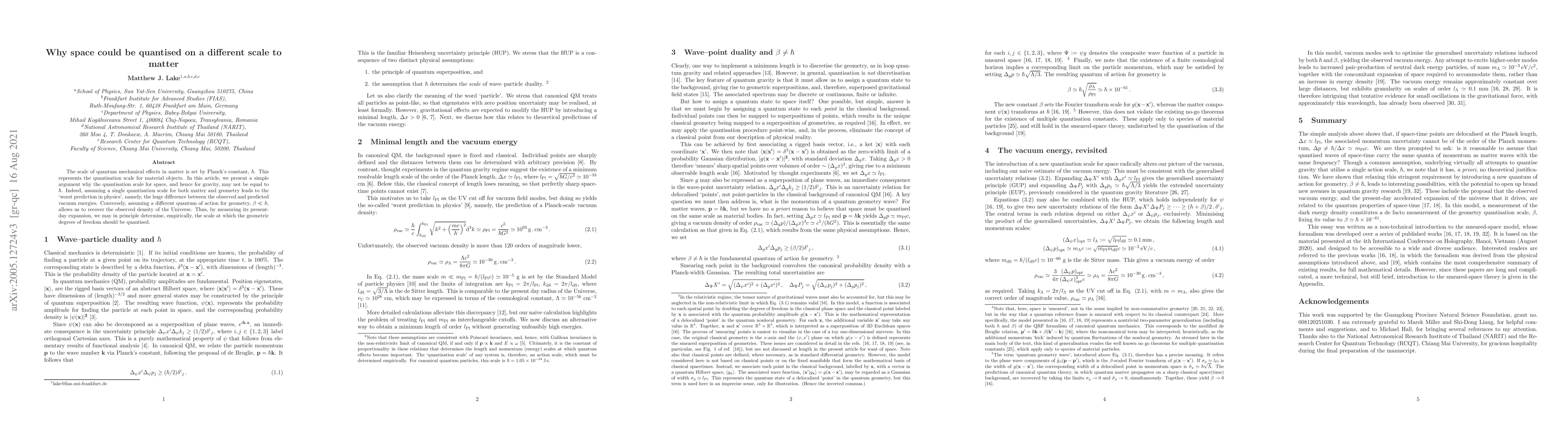 The scale of quantum mechanical effects in matter is set by Planck's constant, $\hbar$. This represents the quantisation scale for material objects. In this article, we present a simple argument why the quantisation scale for space, and hence for gravity, may not be equal to $\hbar$. Indeed, assuming a single quantisation scale for both matter and geometry leads to the `worst prediction in physics', namely, the huge difference between the observed and predicted vacuum energies. Conversely, assuming a different quantum of action for geometry, $\beta \ll \hbar$, allows us to recover the observed density of the Universe. Thus, by measuring its present-day expansion, we may in principle determine, empirically, the scale at which the geometric degrees of freedom should be quantised.