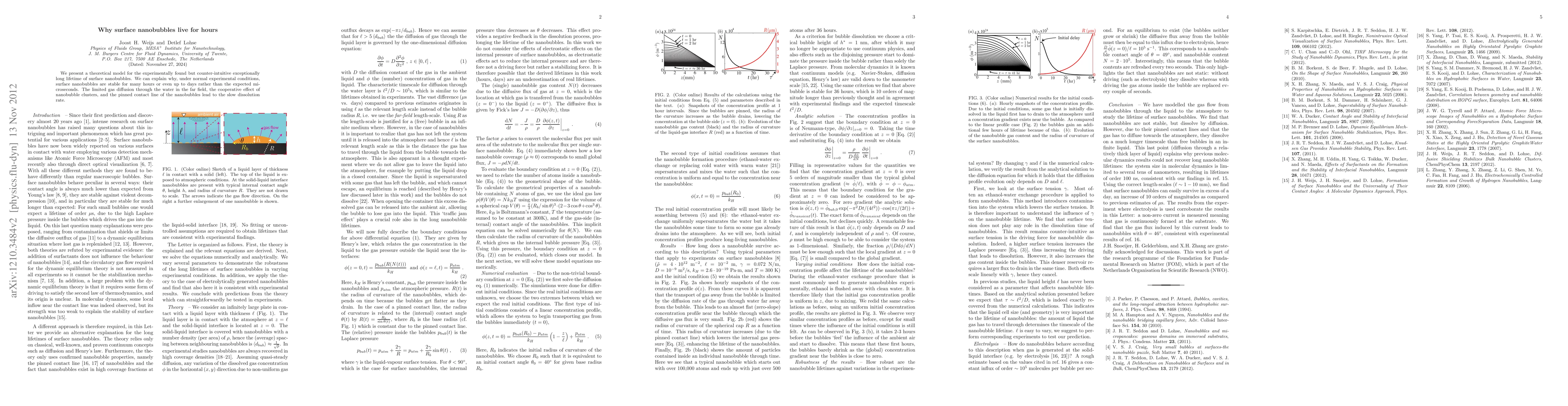 This paper proposes a theoretical model explaining the unusually long lifetime of surface nanobubbles, attributing their stability to limited gas diffusion, cooperative effects among nanobubble clusters, and pinned contact lines. These factors result in a slow dissolution rate, allowing nanobubbles to persist for hours or days.