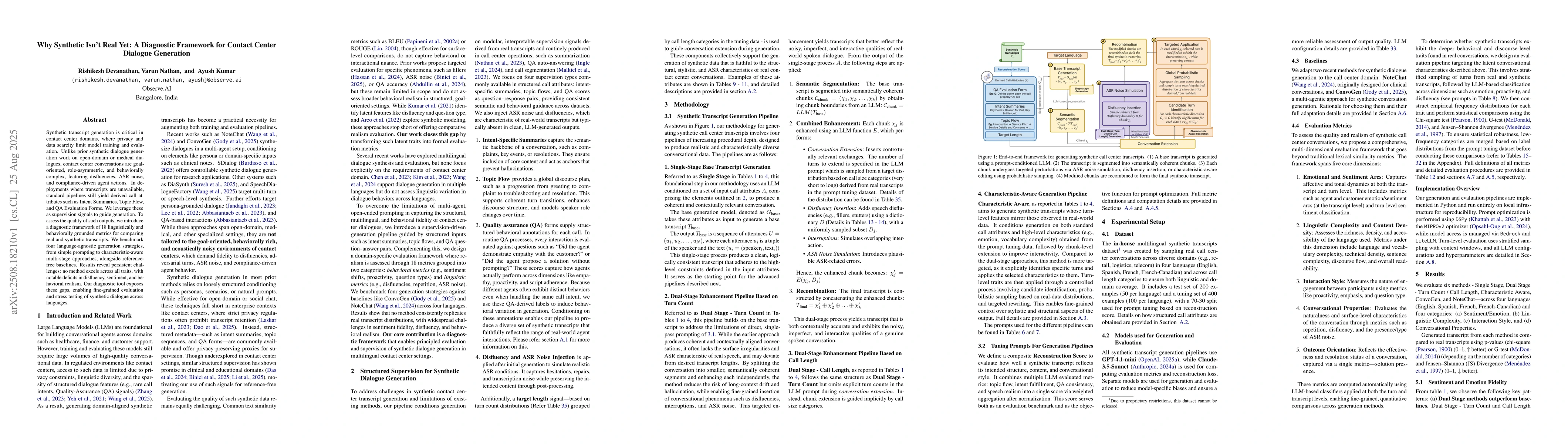Synthetic transcript generation is critical in contact center domains, where privacy and data scarcity limit model training and evaluation. Unlike prior synthetic dialogue generation work on open-domain or medical dialogues, contact center conversations are goal-oriented, role-asymmetric, and behaviorally complex, featuring disfluencies, ASR noise, and compliance-driven agent actions. In deployments where transcripts are unavailable, standard pipelines still yield derived call attributes such as Intent Summaries, Topic Flow, and QA Evaluation Forms. We leverage these as supervision signals to guide generation. To assess the quality of such outputs, we introduce a diagnostic framework of 18 linguistically and behaviorally grounded metrics for comparing real and synthetic transcripts. We benchmark four language-agnostic generation strategies, from simple prompting to characteristic-aware multi-stage approaches, alongside reference-free baselines. Results reveal persistent challenges: no method excels across all traits, with notable deficits in disfluency, sentiment, and behavioral realism. Our diagnostic tool exposes these gaps, enabling fine-grained evaluation and stress testing of synthetic dialogue across languages.