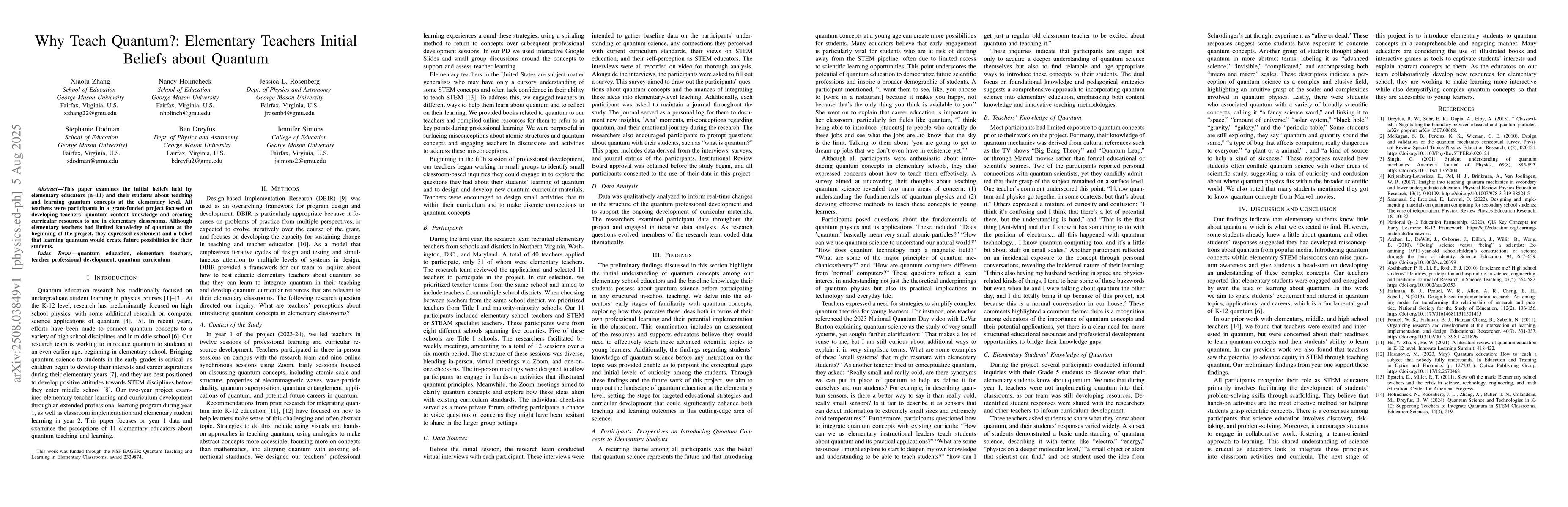 This paper examines the initial beliefs held by elementary educators (n=11) and their students about teaching and learning quantum concepts at the elementary level. All teachers were participants in a grant-funded project focused on developing teachers' quantum content knowledge and creating curricular resources to use in elementary classrooms. Although elementary teachers had limited knowledge of quantum at the beginning of the project, they expressed excitement and a belief that learning quantum would create future possibilities for their students.