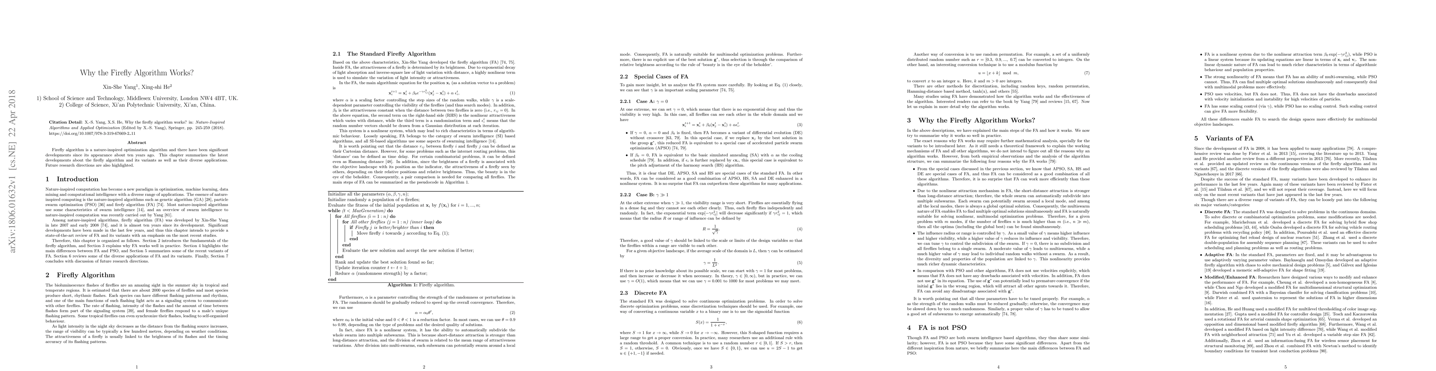 Firefly algorithm is a nature-inspired optimization algorithm and there have been significant developments since its appearance about ten years ago. This chapter summarizes the latest developments about the firefly algorithm and its variants as well as their diverse applications. Future research directions are also highlighted.