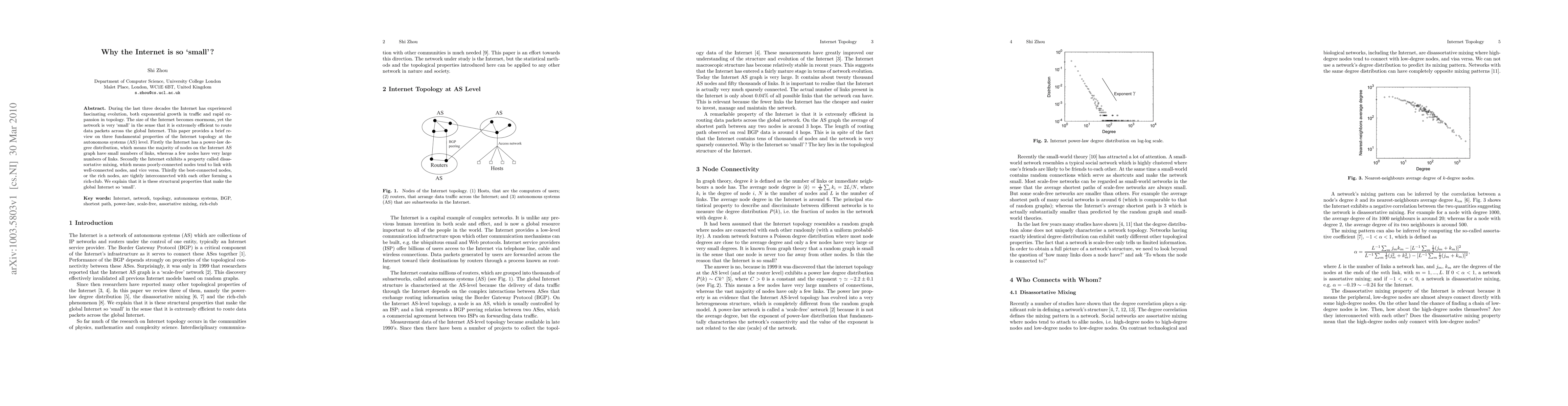 During the last three decades the Internet has experienced fascinating evolution, both exponential growth in traffic and rapid expansion in topology. The size of the Internet becomes enormous, yet the network is very `small' in the sense that it is extremely efficient to route data packets across the global Internet. This paper provides a brief review on three fundamental properties of the Internet topology at the autonomous systems (AS) level. Firstly the Internet has a power-law degree distribution, which means the majority of nodes on the Internet AS graph have small numbers of links, whereas a few nodes have very large numbers of links. Secondly the Internet exhibits a property called disassortative mixing, which means poorly-connected nodes tend to link with well-connected nodes, and vice versa. Thirdly the best-connected nodes, or the rich nodes, are tightly interconnected with each other forming a rich-club. We explain that it is these structural properties that make the global Internet so 'small'.