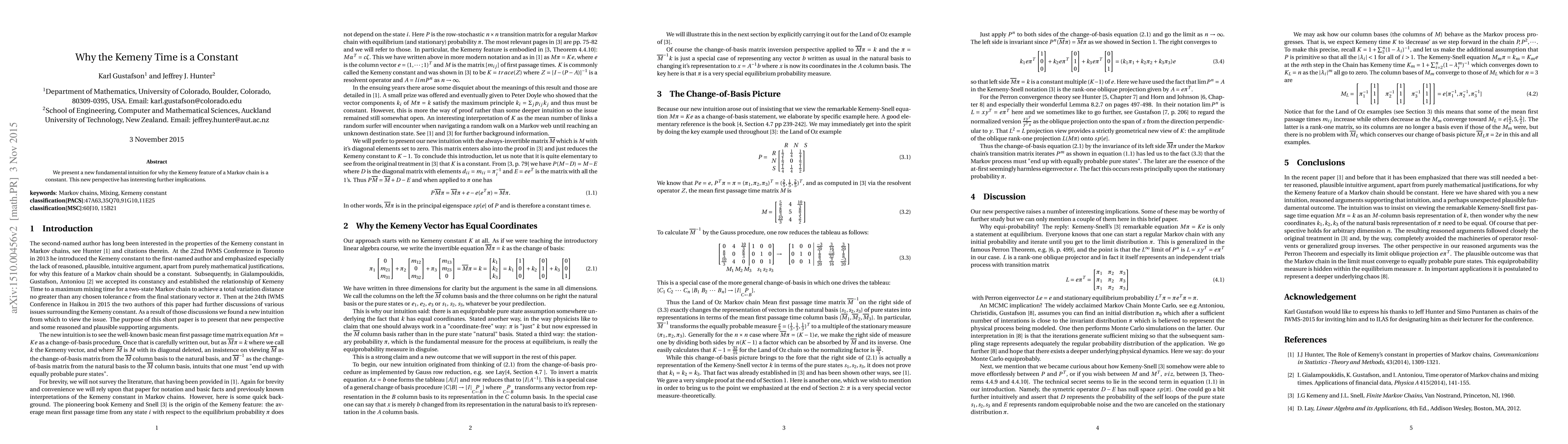 Summary: This paper introduces a novel intuition explaining why the Kemeny feature of a Markov chain remains constant, offering new insights with broader implications for the field.