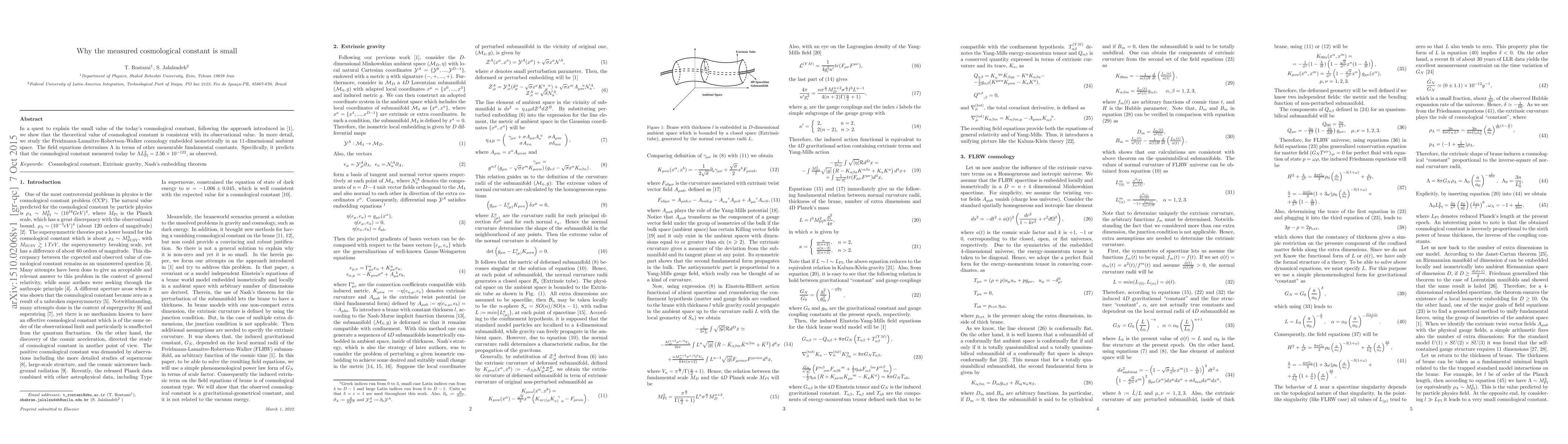 In a quest to explain the small value of the today's cosmological constant, following the approach introduced in [1], we show that the theoretical value of cosmological constant is consistent with its observational value. In more detail, we study the Freidmann-Lama\^{\i}tre-Robertson-Walker cosmology embedded isometrically in an $11$-dimensional ambient space. The field equations determines $\Lambda$ in terms of other measurable fundamental constants. Specifically, it predicts that the cosmological constant measured today be $\Lambda L^2_{\text{Pl}}=2.56\times10^{-122}$, as observed.