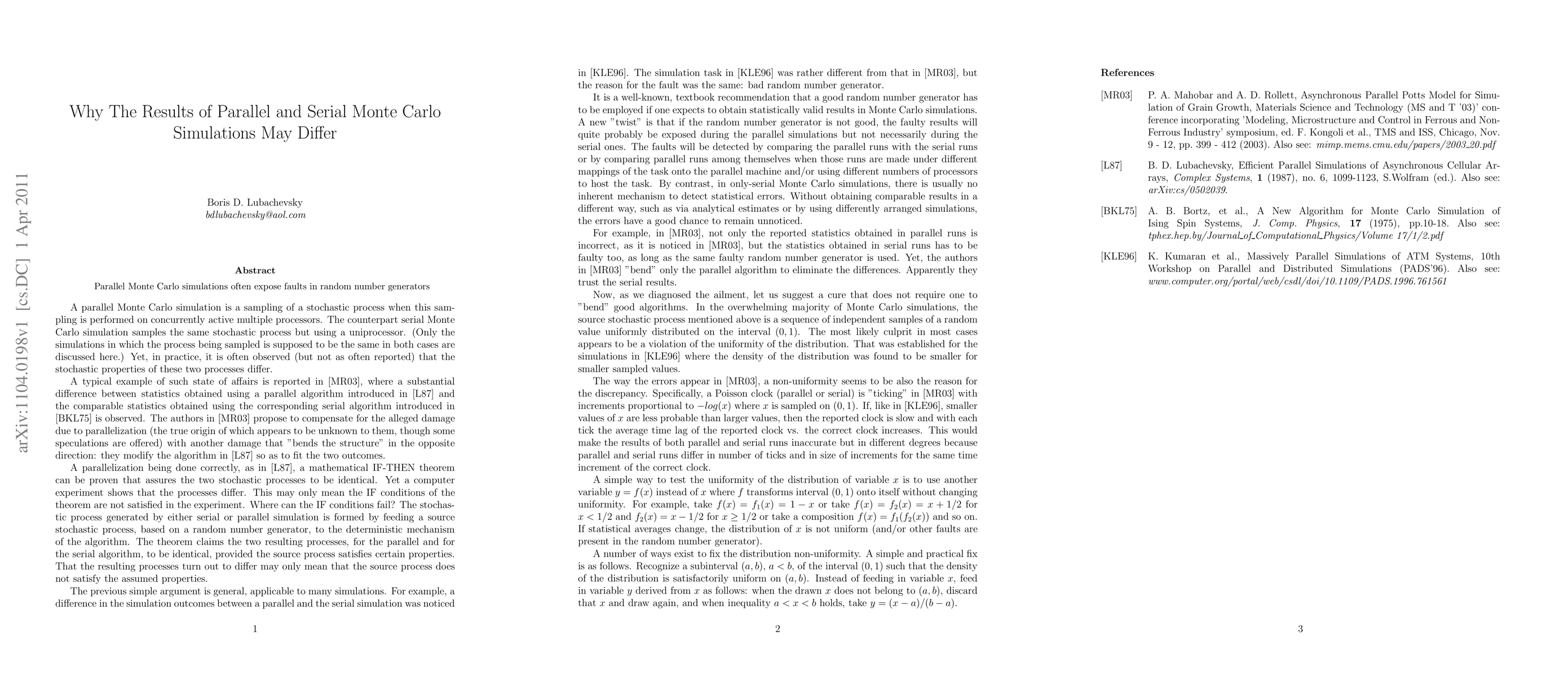Parallel Monte Carlo simulations can expose flaws in random number generators, which may not be apparent when run serially. This discrepancy highlights the importance of using high-quality RNGs for accurate simulation results.