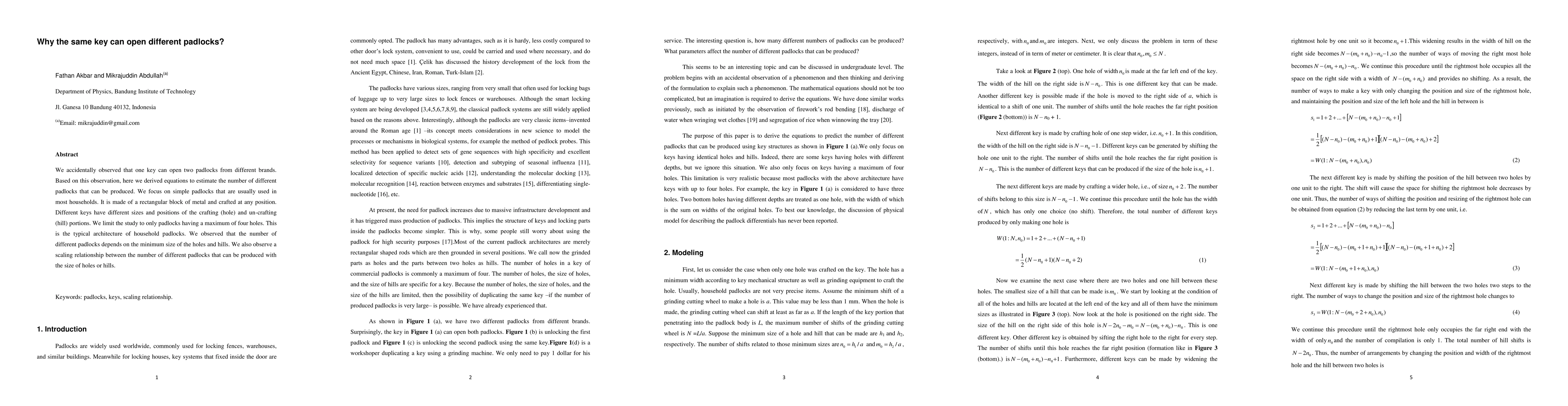 We accidentally observed that one key can open two padlocks from different brands. Based on this observation, here we derived equations to estimate the number of different padlocks that can be produced. We focus on simple padlocks that are usually used in most households. It is made of a rectangular block of metal and crafted at any position. Different keys have different sizes and positions of the crafting (hole) and un-crafting (hill) portions. We limit the study to only padlocks having a maximum of four holes. This is the typical architecture of household padlocks. We observed that the number of different padlocks depends on the minimum size of the holes and hills. We also observe a scaling relationship between the number of different padlocks that can be produced with the size of holes or hills.