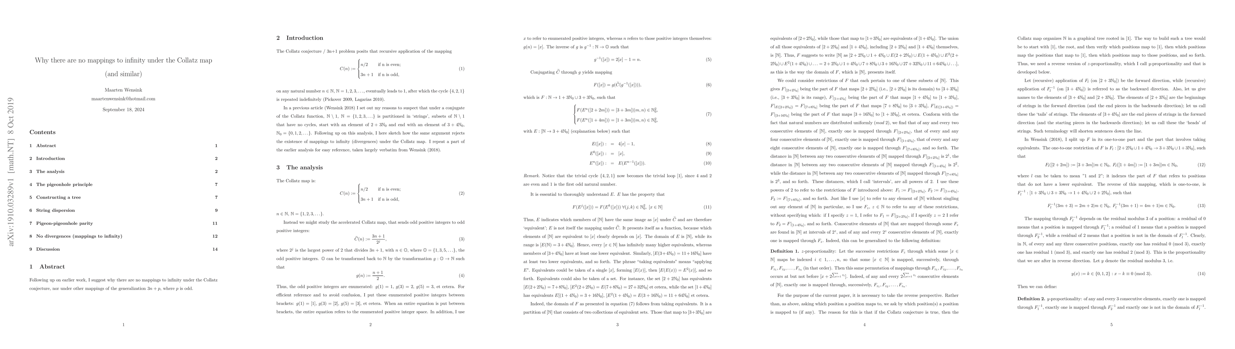 Summary: The paper explores the absence of mappings to infinity under the Collatz conjecture and its generalizations, $3n+p$ (where $p$ is odd), providing a rationale for the conjecture's persistence. It builds on previous research to explain why these sequences do not diverge to infinity.
