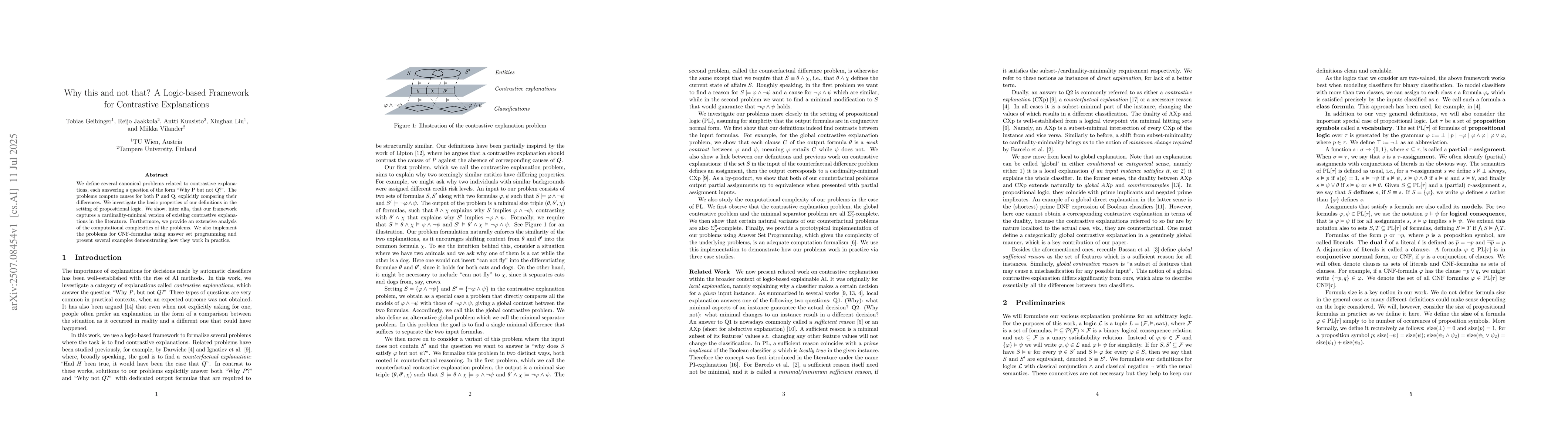 We define several canonical problems related to contrastive explanations, each answering a question of the form ''Why P but not Q?''. The problems compute causes for both P and Q, explicitly comparing their differences. We investigate the basic properties of our definitions in the setting of propositional logic. We show, inter alia, that our framework captures a cardinality-minimal version of existing contrastive explanations in the literature. Furthermore, we provide an extensive analysis of the computational complexities of the problems. We also implement the problems for CNF-formulas using answer set programming and present several examples demonstrating how they work in practice.