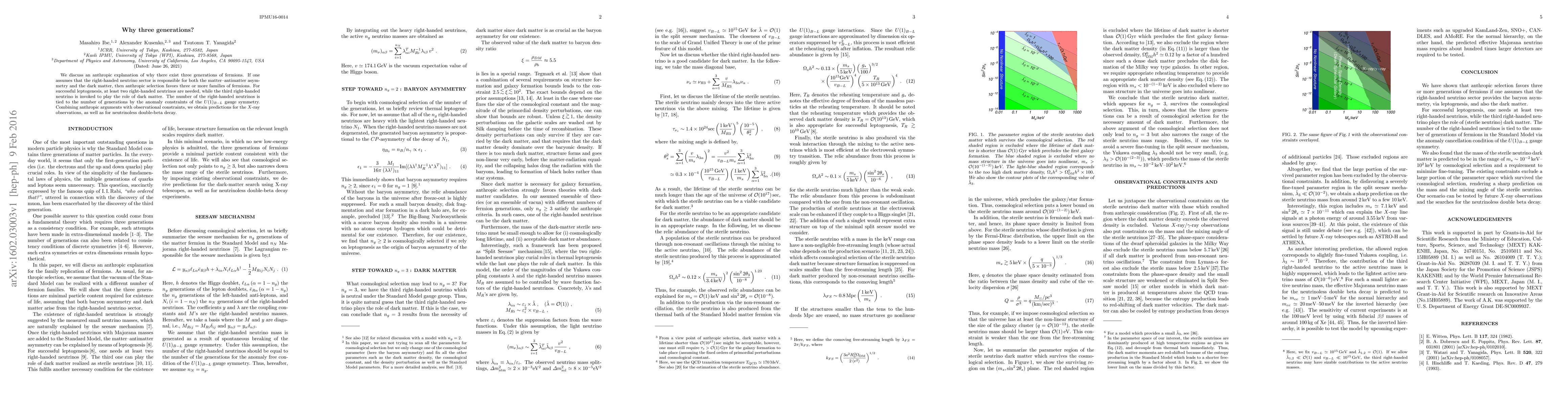 We discuss an anthropic explanation of why there exist three generations of fermions. If one assumes that the right-handed neutrino sector is responsible for both the matter-antimatter asymmetry and the dark matter, then anthropic selection favors three or more families of fermions. For successful leptogenesis, at least two right-handed neutrinos are needed, while the third right-handed neutrino is invoked to play the role of dark matter. The number of the right-handed neutrinos is tied to the number of generations by the anomaly constraints of the $U(1)_{B-L}$ gauge symmetry. Combining anthropic arguments with observational constraints, we obtain predictions for the $X$-ray observations, as well as for neutrinoless double-beta decay.