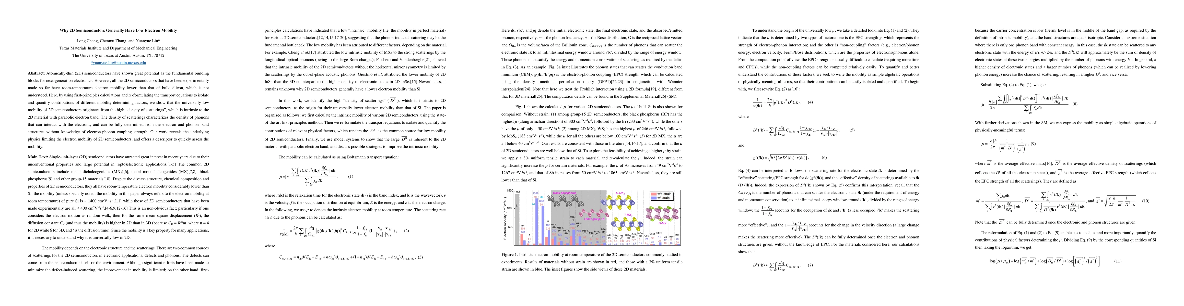 The paper identifies that low electron mobility in two-dimensional semiconductors, compared to bulk silicon, stems from an intrinsic high 'density of scatterings' due to their parabolic electron band, using first-principles calculations and reformulated transport equations. This density characterizes the interaction of phonons with electrons, revealing the fundamental physics behind the mobility limitation.