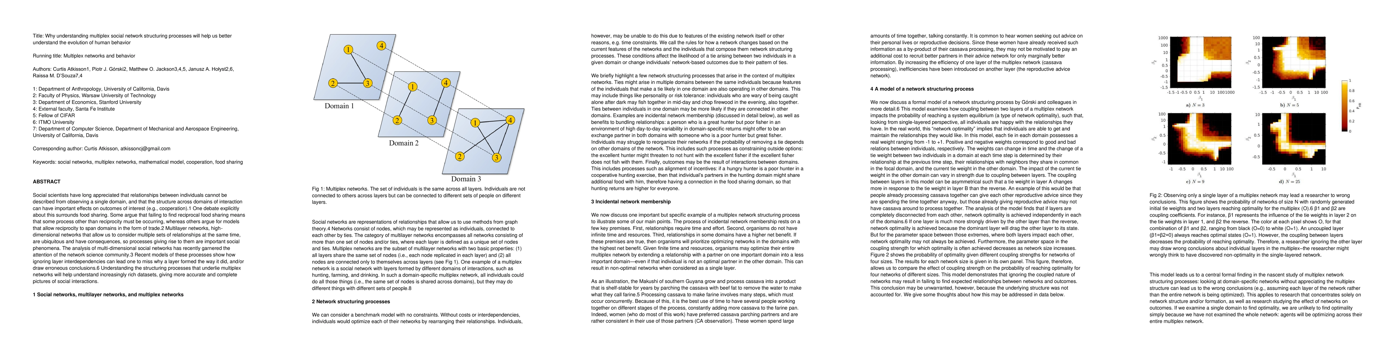 Social scientists have long appreciated that relationships between individuals cannot be described from observing a single domain, and that the structure across domains of interaction can have important effects on outcomes of interest (e.g., cooperation).1 One debate explicitly about this surrounds food sharing. Some argue that failing to find reciprocal food sharing means that some process other than reciprocity must be occurring, whereas others argue for models that allow reciprocity to span domains in the form of trade.2 Multilayer networks, high-dimensional networks that allow us to consider multiple sets of relationships at the same time, are ubiquitous and have consequences, so processes giving rise to them are important social phenomena. The analysis of multi-dimensional social networks has recently garnered the attention of the network science community.3 Recent models of these processes show how ignoring layer interdependencies can lead one to miss why a layer formed the way it did, and/or draw erroneous conclusions.6 Understanding the structuring processes that underlie multiplex networks will help understand increasingly rich datasets, giving more accurate and complete pictures of social interactions.