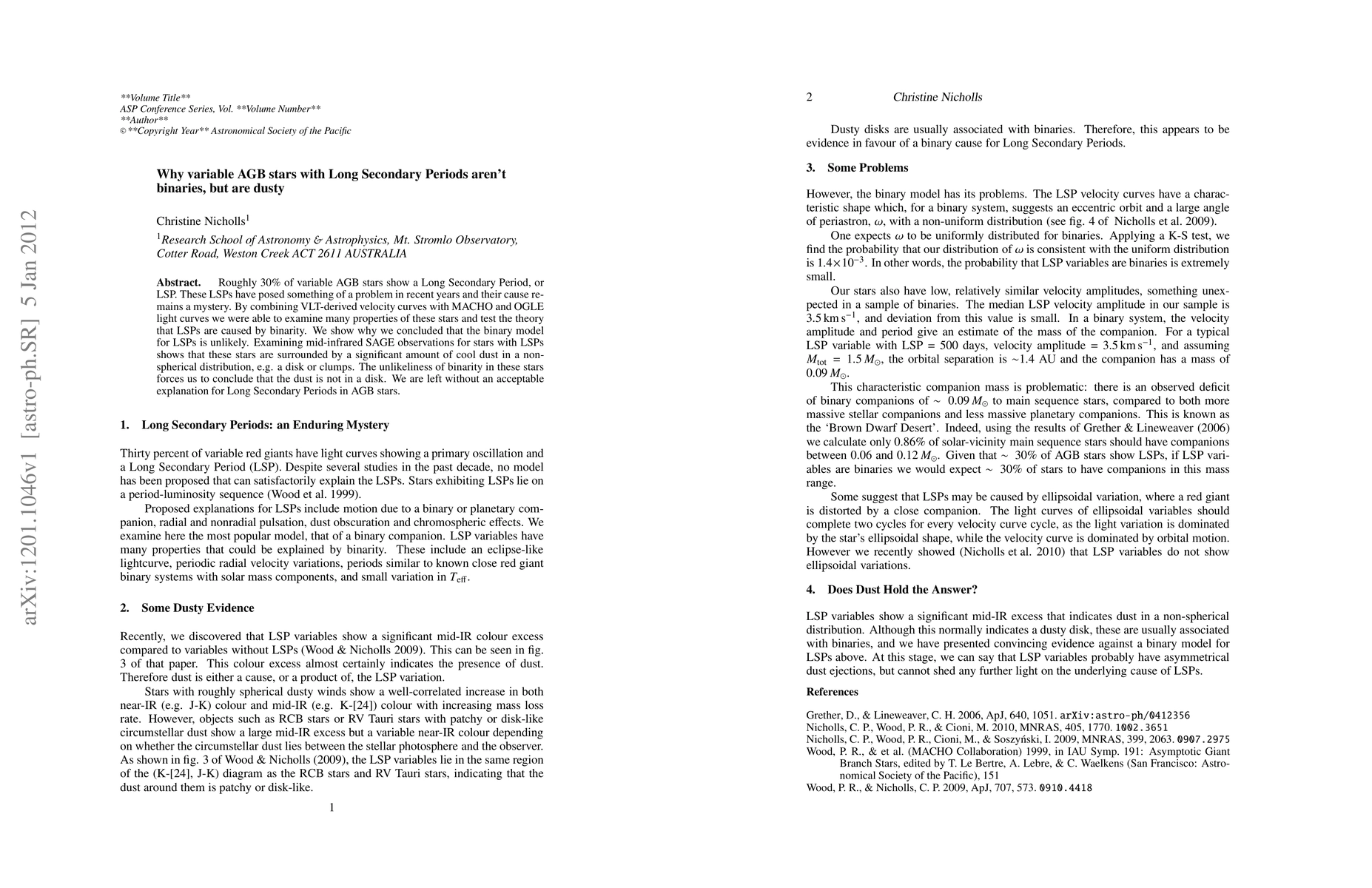 Roughly 30% of variable AGB stars show a Long Secondary Period, or LSP. These LSPs have posed something of a problem in recent years and their cause remains a mystery. By combining VLT-derived velocity curves with MACHO and OGLE light curves we were able to examine many properties of these stars and test the theory that LSPs are caused by binarity. We show why we concluded that the binary model for LSPs is unlikely. Examining mid-infrared SAGE observations for stars with LSPs shows that these stars are surrounded by a significant amount of cool dust in a nonspherical distribution, e.g. a disk or clumps. The unlikeliness of binarity in these stars forces us to conclude that the dust is not in a disk. We are left without an acceptable explanation for Long Secondary Periods in AGB stars.
