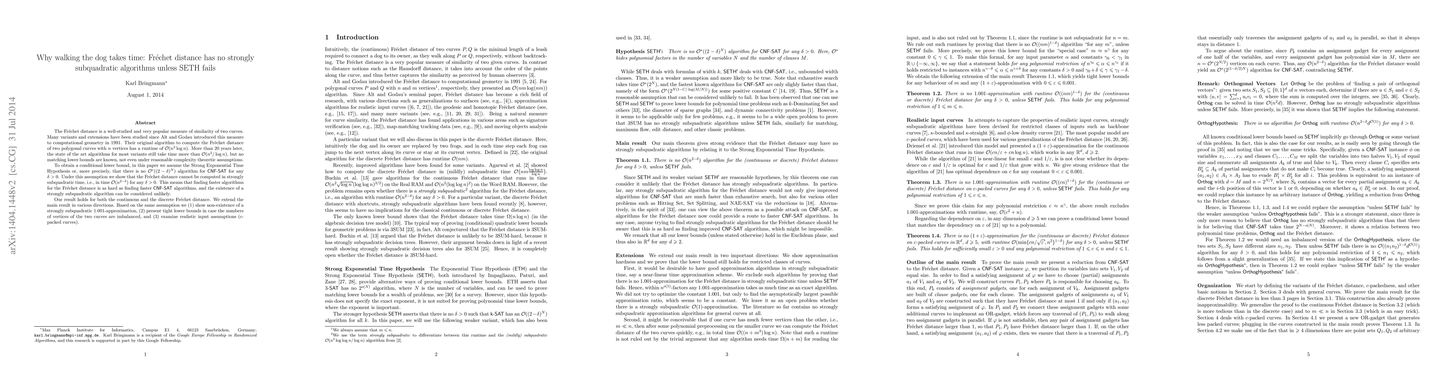 This paper establishes a conditional lower bound for computing the Frechet distance, showing that no strongly subquadratic algorithms exist under the Strong Exponential Time Hypothesis (SETH). This implies that finding faster algorithms for Frechet distance is as challenging as improving CNF-SAT algorithms, suggesting the unlikely existence of such subquadratic time solutions.
