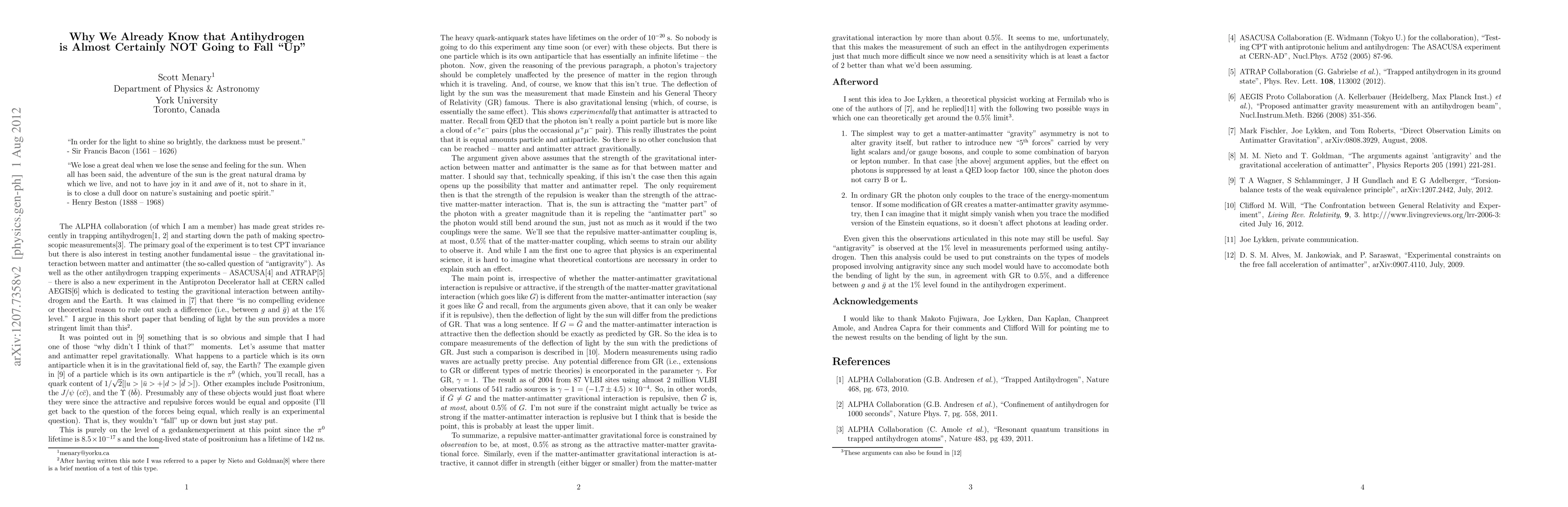 The ALPHA collaboration (of which I am a member) has made great strides recently in trapping antihydrogen and starting down the path of making spectroscopic measurements. The primary goal of the experiment is to test CPT invariance but there is also interest in testing another fundamental issue -- the gravitational interaction between matter and antimatter (the so-called question of "antigravity"). As well as the other antihydrogen trapping experiments -- ASACUSA and ATRAP -- there is also a new experiment in the Antiproton Decelerator hall at CERN called AEGIS which is dedicated to testing the gravitional interaction between antihydrogen and the Earth. It has been claimed in the literature that there "is no compelling evidence or theoretical reason to rule out such a difference (i.e., between $g$ and $\bar{g}$) at the 1% level." I argue in this short paper that bending of light by the sun provides a more stringent limit than this.