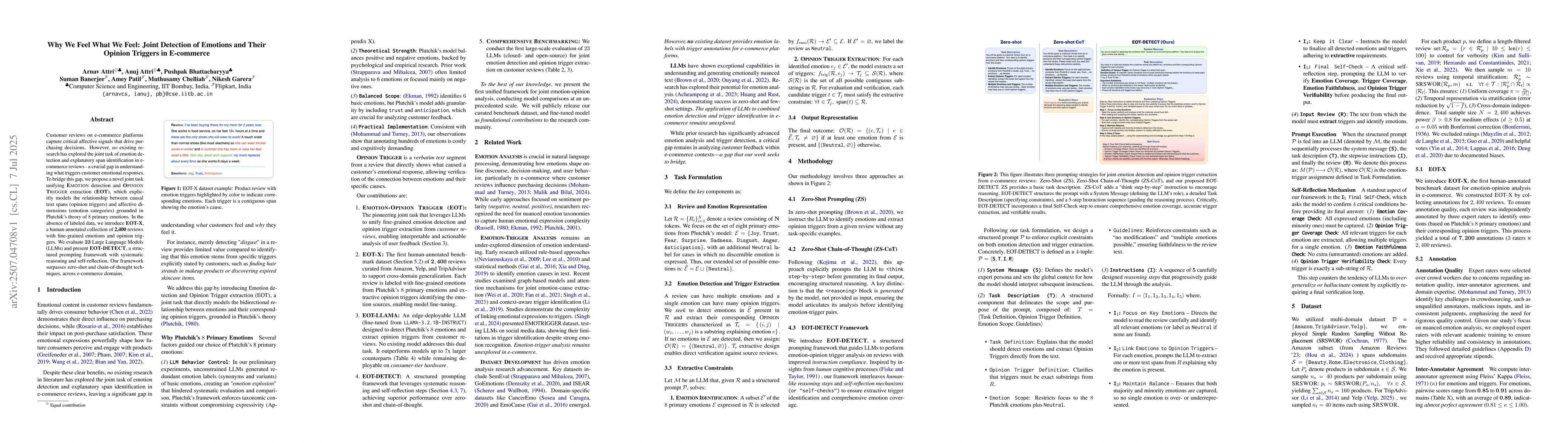 Customer reviews on e-commerce platforms capture critical affective signals that drive purchasing decisions. However, no existing research has explored the joint task of emotion detection and explanatory span identification in e-commerce reviews - a crucial gap in understanding what triggers customer emotional responses. To bridge this gap, we propose a novel joint task unifying Emotion detection and Opinion Trigger extraction (EOT), which explicitly models the relationship between causal text spans (opinion triggers) and affective dimensions (emotion categories) grounded in Plutchik's theory of 8 primary emotions. In the absence of labeled data, we introduce EOT-X, a human-annotated collection of 2,400 reviews with fine-grained emotions and opinion triggers. We evaluate 23 Large Language Models (LLMs) and present EOT-DETECT, a structured prompting framework with systematic reasoning and self-reflection. Our framework surpasses zero-shot and chain-of-thought techniques, across e-commerce domains.