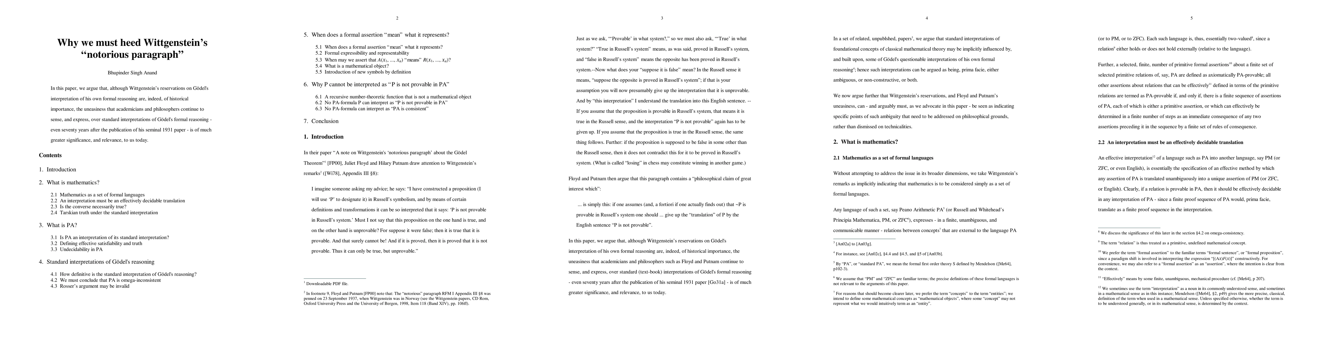 We argue that, although Wittgenstein's reservations on Goedel's interpretation of his own formal reasoning are, indeed, of historical importance, the uneasiness that academicians and philosophers continue to sense, and express, over standard interpretations of Goedel's formal reasoning - even seventy years after the publication of his seminal 1931 paper - is of much greater significance, and relevance, to us today.