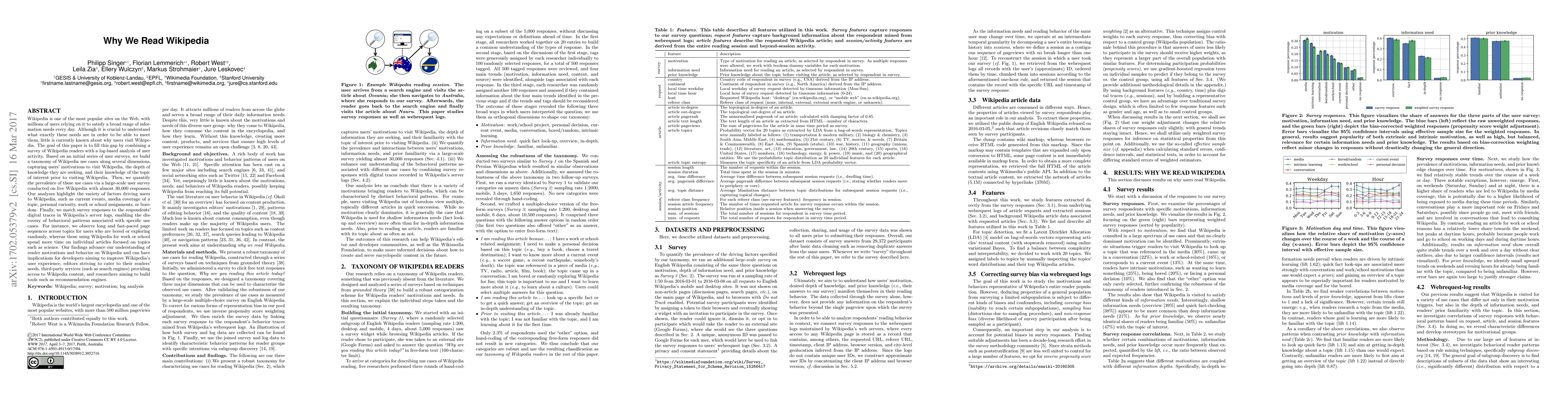 Wikipedia is one of the most popular sites on the Web, with millions of users relying on it to satisfy a broad range of information needs every day. Although it is crucial to understand what exactly these needs are in order to be able to meet them, little is currently known about why users visit Wikipedia. The goal of this paper is to fill this gap by combining a survey of Wikipedia readers with a log-based analysis of user activity. Based on an initial series of user surveys, we build a taxonomy of Wikipedia use cases along several dimensions, capturing users' motivations to visit Wikipedia, the depth of knowledge they are seeking, and their knowledge of the topic of interest prior to visiting Wikipedia. Then, we quantify the prevalence of these use cases via a large-scale user survey conducted on live Wikipedia with almost 30,000 responses. Our analyses highlight the variety of factors driving users to Wikipedia, such as current events, media coverage of a topic, personal curiosity, work or school assignments, or boredom. Finally, we match survey responses to the respondents' digital traces in Wikipedia's server logs, enabling the discovery of behavioral patterns associated with specific use cases. For instance, we observe long and fast-paced page sequences across topics for users who are bored or exploring randomly, whereas those using Wikipedia for work or school spend more time on individual articles focused on topics such as science. Our findings advance our understanding of reader motivations and behavior on Wikipedia and can have implications for developers aiming to improve Wikipedia's user experience, editors striving to cater to their readers' needs, third-party services (such as search engines) providing access to Wikipedia content, and researchers aiming to build tools such as recommendation engines.