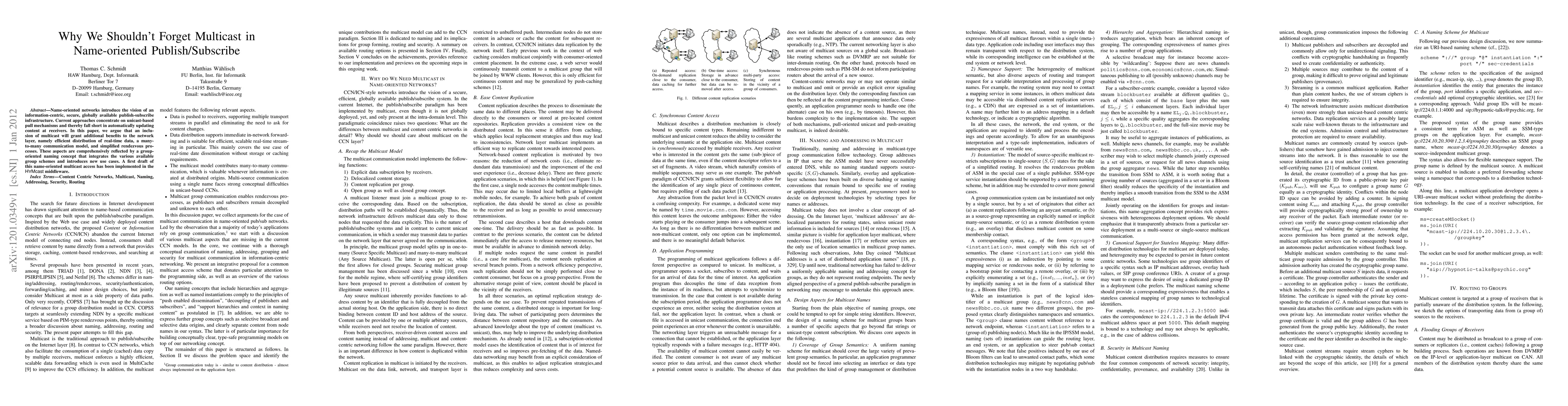 A research paper argues that multicast should be included in name-oriented publish/subscribe networks to improve real-time data distribution, many-to-many communication, and rendezvous processes. It introduces a group-oriented naming concept that integrates existing group schemes and enhances the network layer.