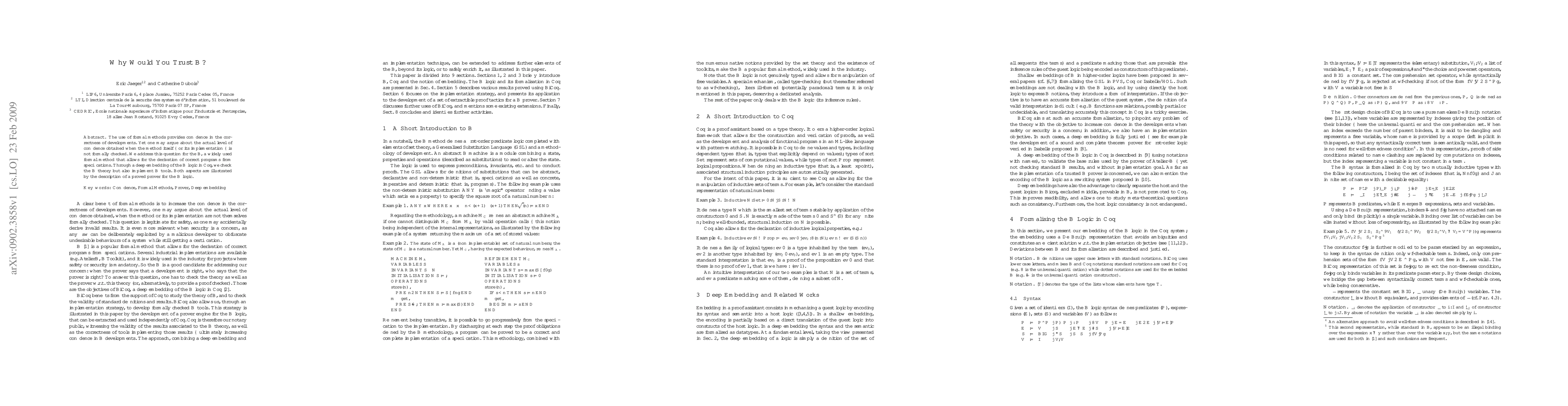 The use of formal methods provides confidence in the correctness of developments. Yet one may argue about the actual level of confidence obtained when the method itself -- or its implementation -- is not formally checked. We address this question for the B, a widely used formal method that allows for the derivation of correct programs from specifications. Through a deep embedding of the B logic in Coq, we check the B theory but also implement B tools. Both aspects are illustrated by the description of a proved prover for the B logic.
